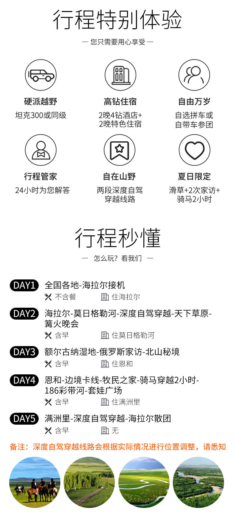 4、門票:額爾古納濕地景區+環保車、套娃廣場表演套票(大馬戲表演為7-8月開始,其他游覽項目正常開放,如因景區原因或下雨等惡劣天氣取消不退費用);