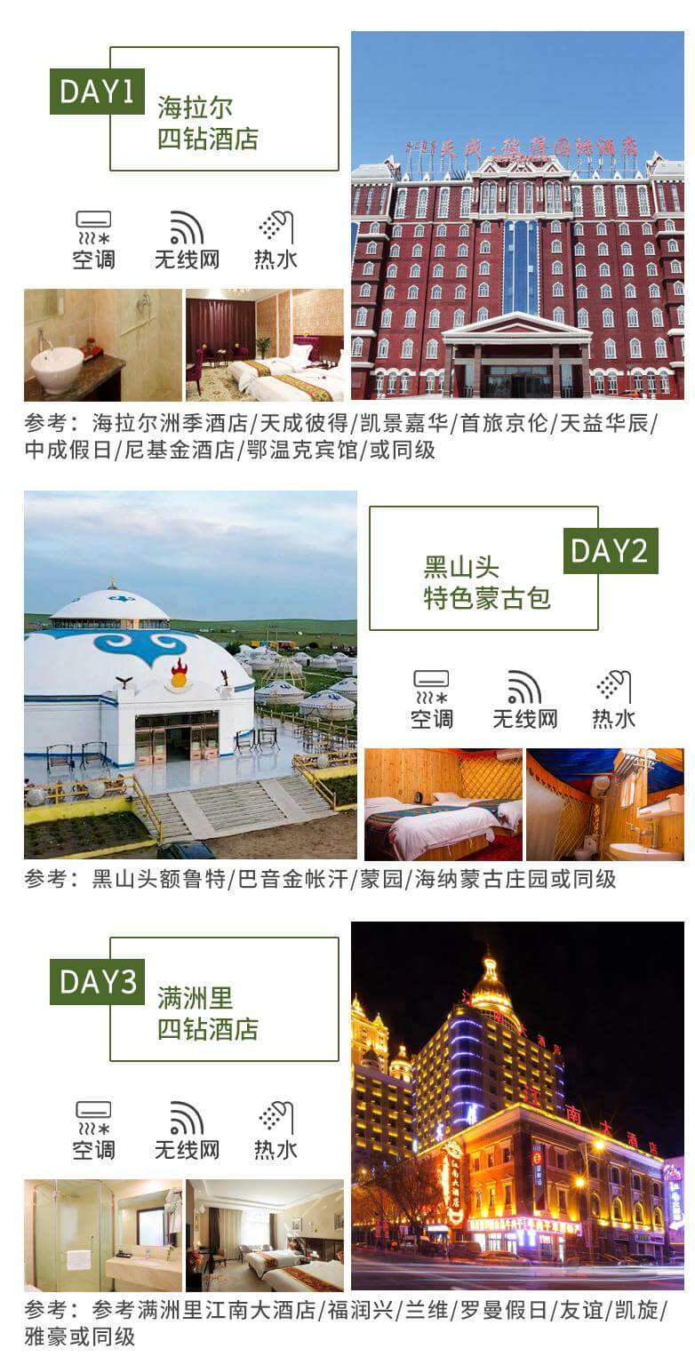 1、住宿:海拉爾四鉆酒店標間1晚、黑山頭特色蒙古包標間1晚、滿洲里四鉆酒店標間1晚