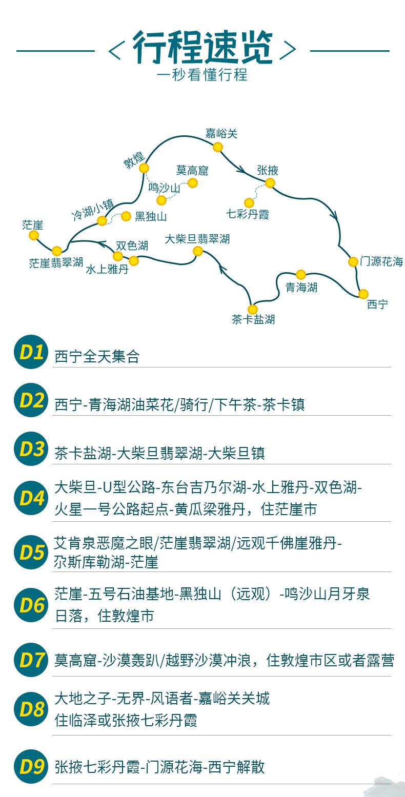 精華美景:國內最大內陸湖泊青海湖、天空之境茶卡鹽湖、黃瓜梁雅丹、尕斯庫勒湖、東方藝術寶庫莫高窟、中國最美沙漠之一鳴沙山月牙泉、天下雄關嘉峪關、中國最美丹霞地貌之一七彩丹霞、青海湖油菜花+門源花海(6月末到7月末花期內安排雙次觀賞);