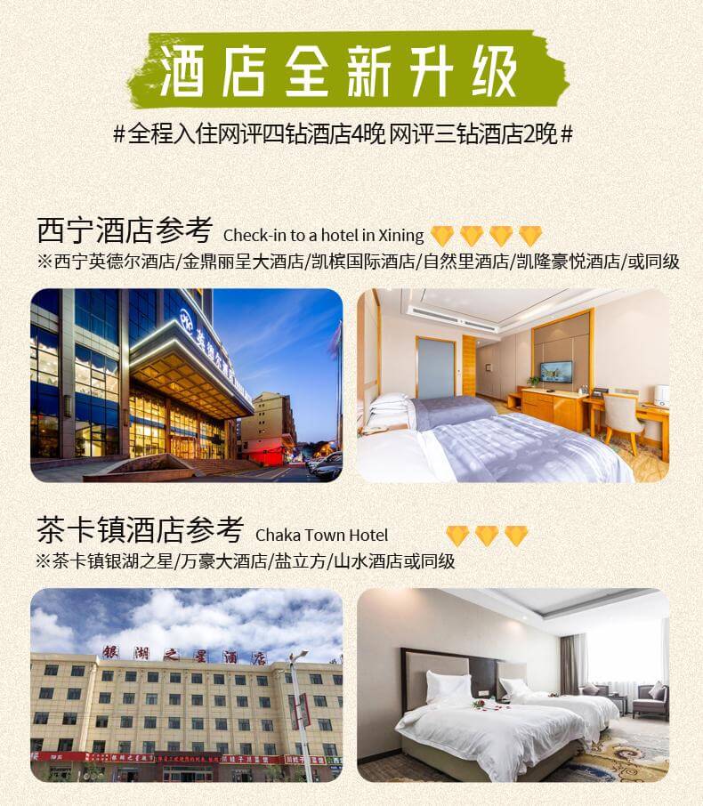 1、住宿:西寧4鉆酒店標(biāo)間1晚、茶卡鎮(zhèn)3鉆酒店標(biāo)間1晚、大柴旦3鉆酒店標(biāo)間1晚、敦煌4鉆/星酒店標(biāo)間2晚、酒泉4鉆/星酒店標(biāo)間1晚、祁連縣4鉆/星酒店標(biāo)間1晚;(西北地區(qū)發(fā)展落后,網(wǎng)評4鉆為當(dāng)?shù)販?zhǔn)五星酒店,網(wǎng)評3鉆為當(dāng)?shù)販?zhǔn)四星酒店)