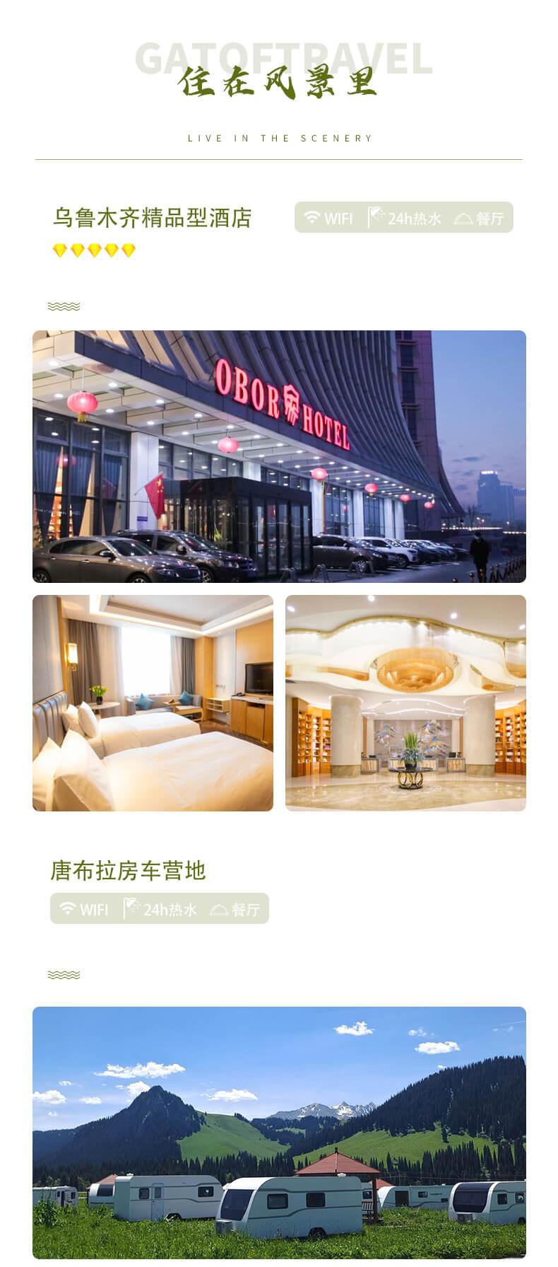 1、住宿:烏魯木齊市精品型酒店雙標(biāo)間1晚,唐布拉房車營地1晚,那拉提鎮(zhèn)精品型酒店雙標(biāo)間1晚,庫爾德寧野奢帳篷營地1晚,喀拉峻草原觀景民宿1晚,瓊庫什臺觀景民宿1晚,賽里木湖景區(qū)營地1晚。