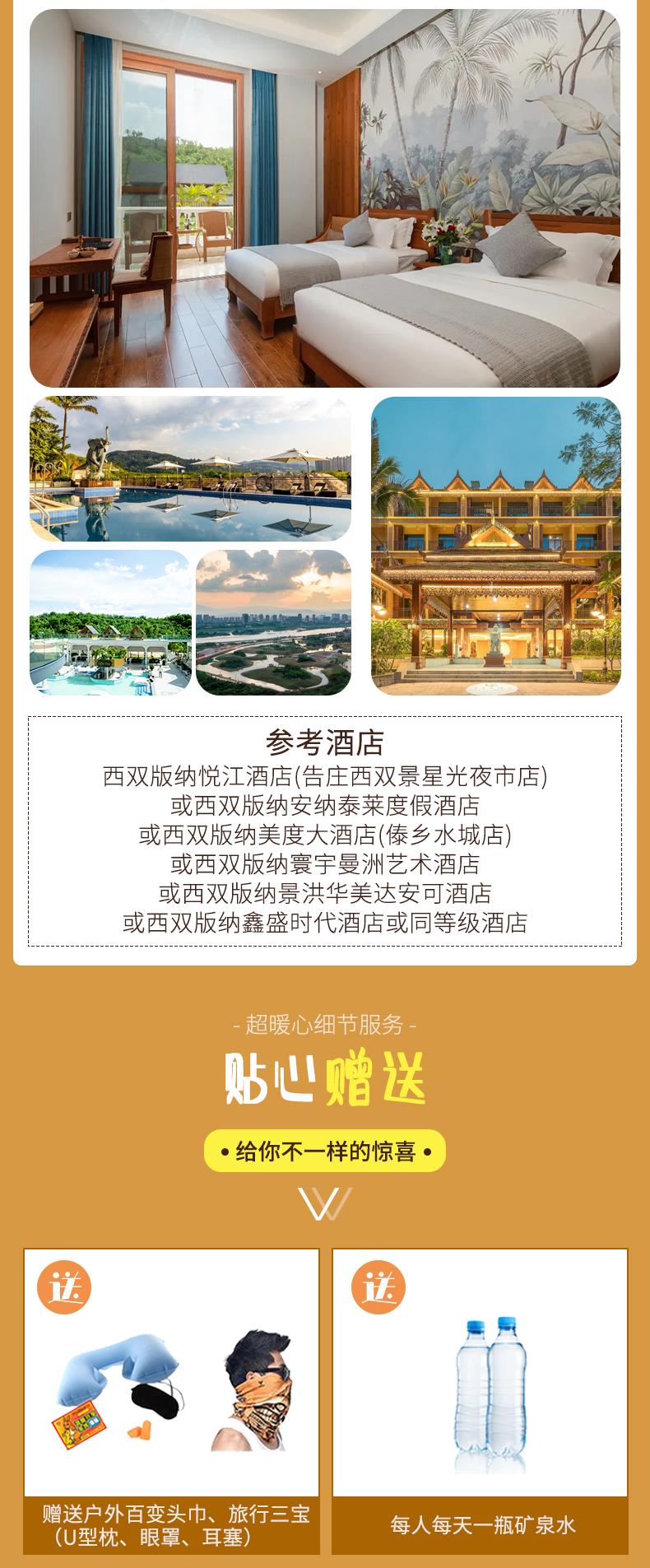 1、住宿:景洪4晚(參考酒店:西雙版納悅江酒店或西雙版納美度大酒店(傣鄉水城店)或西雙版納安納泰萊度假酒店或西雙版納寰宇曼洲藝術酒店或西雙版納景洪華美達安可酒店或西雙版納鑫盛時代酒店或同等級酒店);