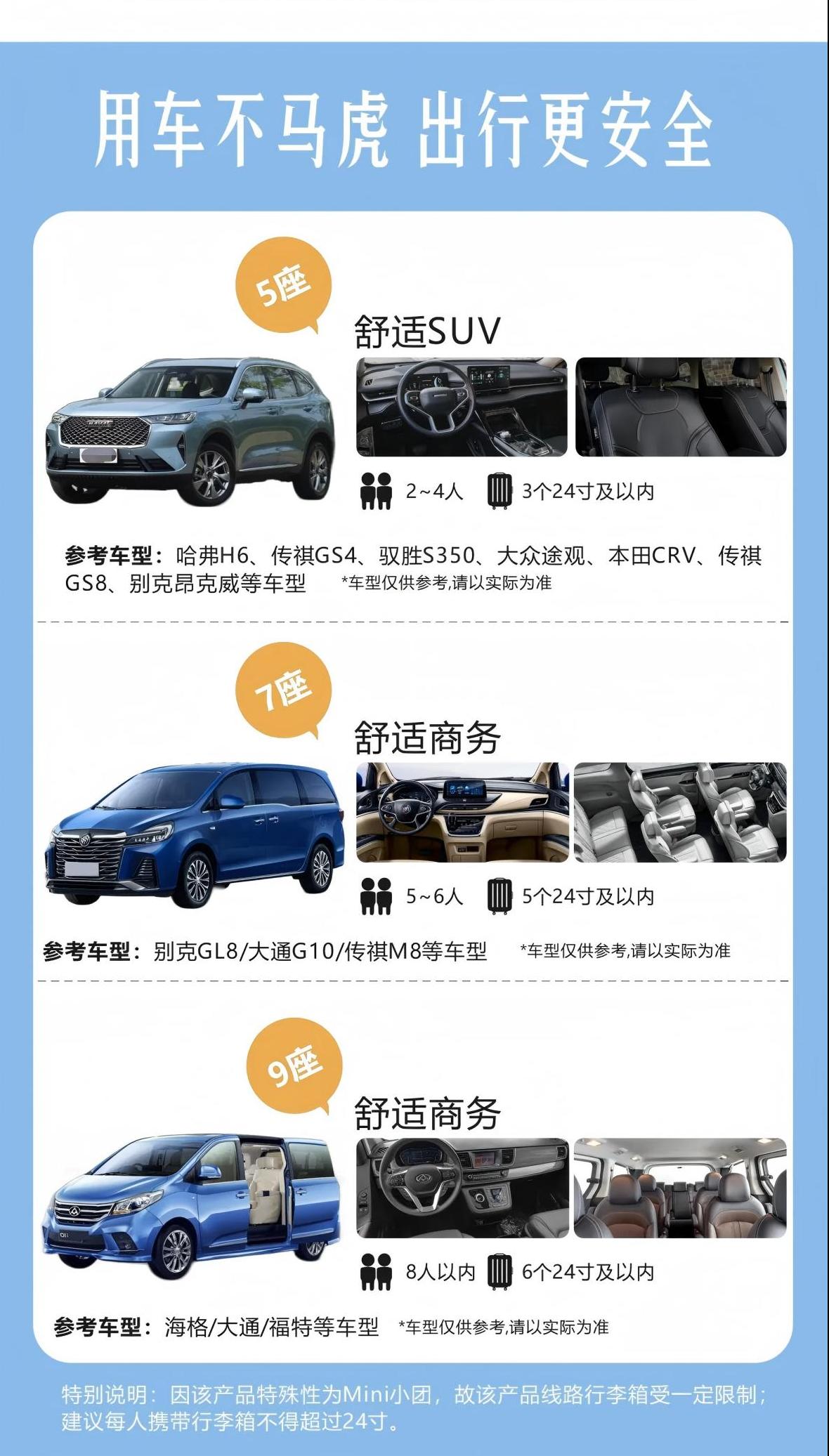 2、小車(chē)出行:5座舒適SUV或7座舒適商務(wù)車(chē),出行更安全,全程獨(dú)立用車(chē);