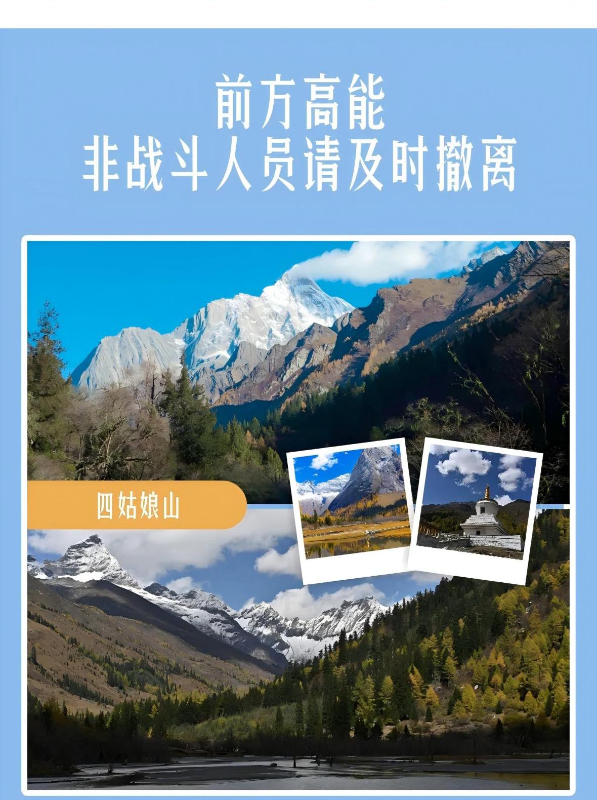 5、四姑娘山景區(qū)旺季限流,請(qǐng)務(wù)必提前預(yù)約購(gòu)票,現(xiàn)場(chǎng)刷證入園;預(yù)定渠道:阿壩旅游網(wǎng)公眾號(hào)