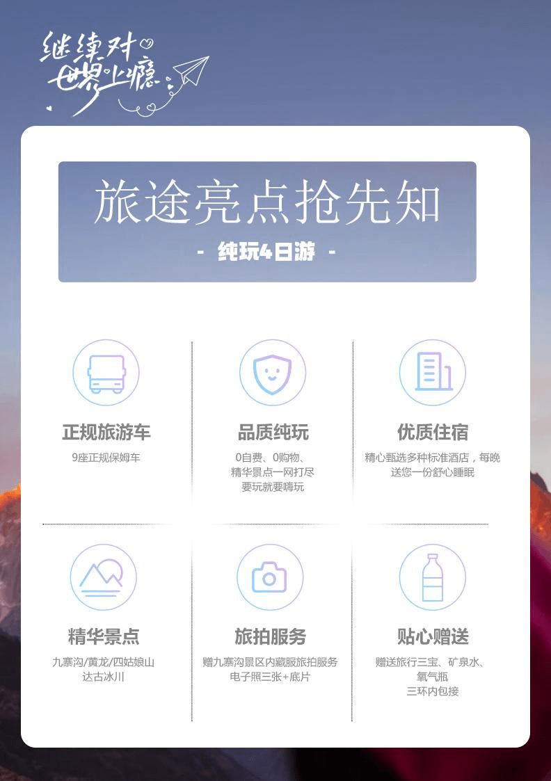 (1)旅游系長距離、長時間活動,途中乘坐各種交通的時間較長,加之食宿條件不同于平常習慣,可能會比較辛苦,四川甘孜州、阿壩州等高原地區海撥高有可能有高原反應的,請權衡自己的健康狀況是否適應本次旅行。