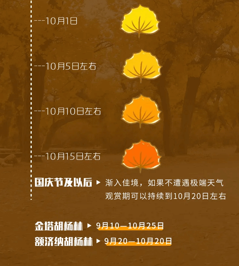 黃葉葉子變黃、與氣溫、溫度、濕度、樹齡等都有關系。一般來說,最低氣溫降至5度左右時開始有黃葉,水分少的區(qū)域先黃、樹齡少的葉子先黃。根據(jù)往年經(jīng)驗,每年9月10日左右開始有局部的黃葉,每年的9月20號左右正是胡楊葉轉紅的時間,10月初至中旬,胡楊葉子黃得最亮麗,林子多數(shù)都是黃的,要求幾十萬畝的林子完全變黃基本不可能的哦。如果天氣穩(wěn)定,黃葉可以持續(xù)到10月中下旬,如果寒流頻繁,就會提前落葉,敬請諒解。