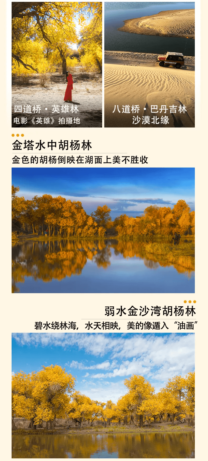 精華秋色:額濟納秋色胡楊林全天游覽,打卡弱水金沙灣胡楊林,贈送胡楊拍照神器(秋景視季節(jié)及天氣變化影響可能會有葉子未黃或提前掉落,敬請諒解)