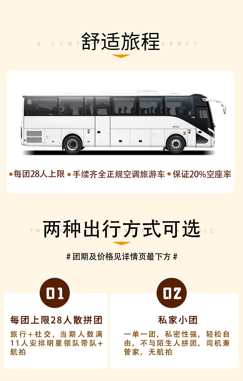 舒適旅程:每團28人上限,保證20%空座率,老司機開路,保障旅途舒適舒心;