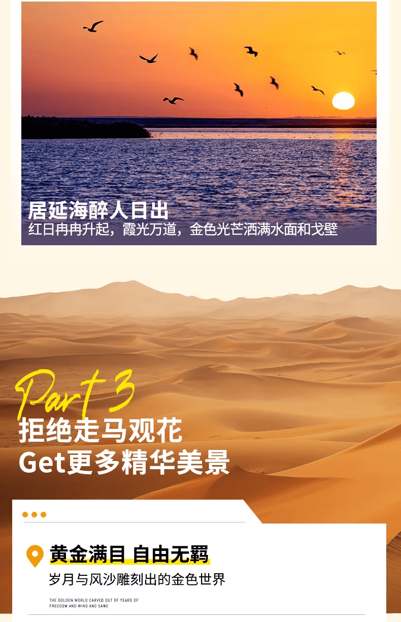 2.我們?yōu)楦魑毁徺I的是額濟納胡楊林通票,包含景點:陶來林、戀影林、二道橋塔王府、倒影林、三道橋紅柳海觀景平臺、四道橋英雄林、五道橋胡楊民俗風情園、七道橋夢境林、太陽湖、八道橋巴丹吉林沙漠北緣,大家在自由活動期間可以隨意暢玩!