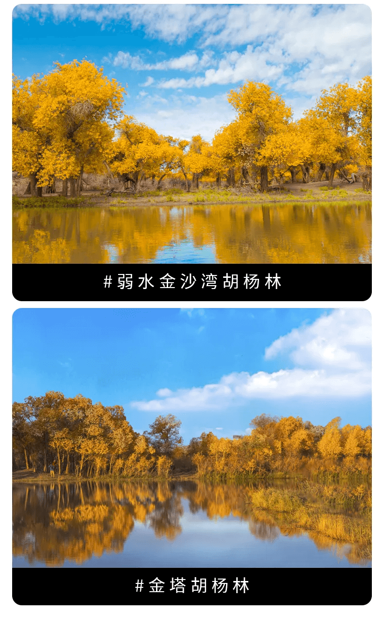 13:00 到達【金塔胡楊林】,和我們后天前往的額濟納胡楊相比,這里的胡楊林面積相對小一些,但是平添一分秀麗;這里也是樹蔭遮天,林中有一個不大不小的金波湖,金色的胡楊倒映在湖面上美不勝收,遠處也有起伏的沙漠和椰棗林。