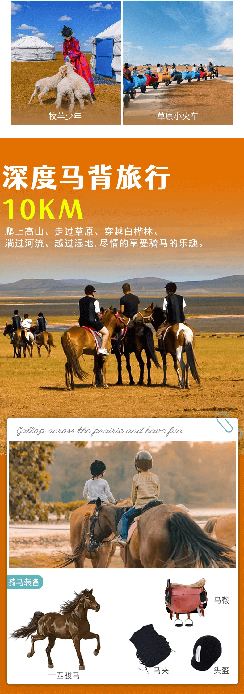 9.騎馬:草原上騎馬要在指定范圍內活動,以免迷失方向或破壞草場。在大草原上騎馬暢游,要帶手套及旅游鞋。草原騎馬時,一定要聽從當地牧馬人的安排和指揮,以免發生危險。騎馬需注意安全,第一次騎馬最好由馬夫牽方能騎,不要獨自騎馬,更不能騎馬奔跑,險路和下坡路必須下馬步行,否則容易受傷。盡量不要在備馬區奔跑嬉戲喧嘩,以免嚇到馬。不要在馬附近開自動傘,接近馬時不要做劇烈運動,以免使馬受驚。不要隨便給馬喂食,防止被馬咬傷。(1.2米以下及60周歲以上不建議騎馬)。