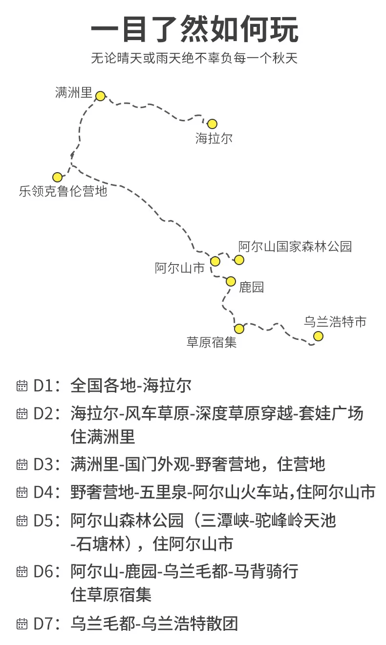 2、阿爾山景區(qū)較大,我們甄選精華景點(diǎn)走完,根據(jù)實(shí)際情況可能會(huì)有先后順序調(diào)換,行程時(shí)間僅供參考;