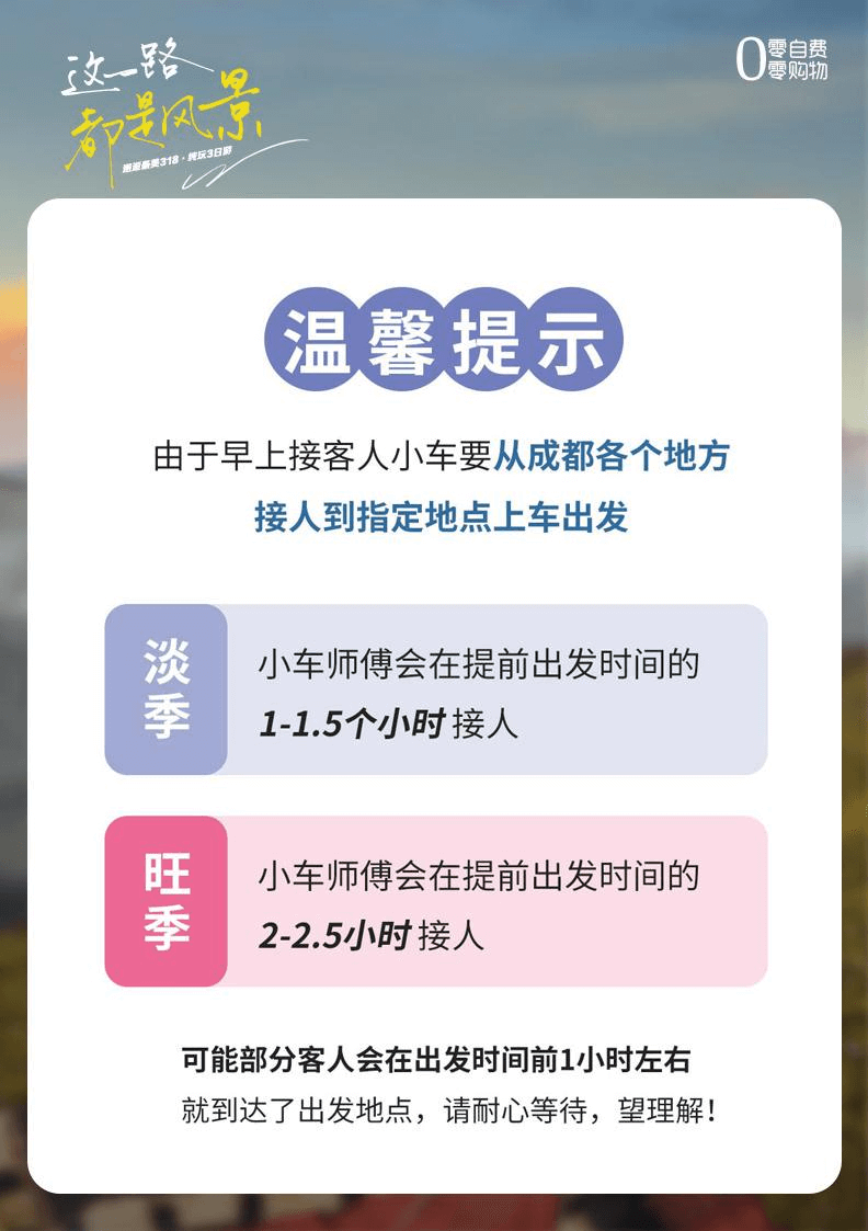 注:此行程免費贈送成都市三環內包接服務,接人師傅會在出團前一天晚 6 點——9 點與您聯系,請保持手機暢通,注意接聽電話。?