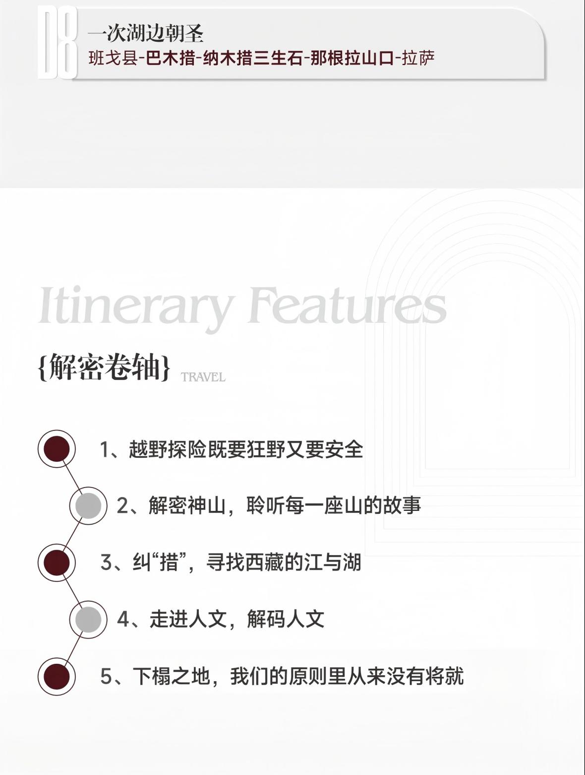 行程張弛有度,拒絕超長車程,不走回頭路,盡興游玩;行程海拔由低往高逐漸攀升,更不易高反;藏地精華景點一網打盡,日落金山、高山圣湖、森林草原,享一場視覺盛宴!