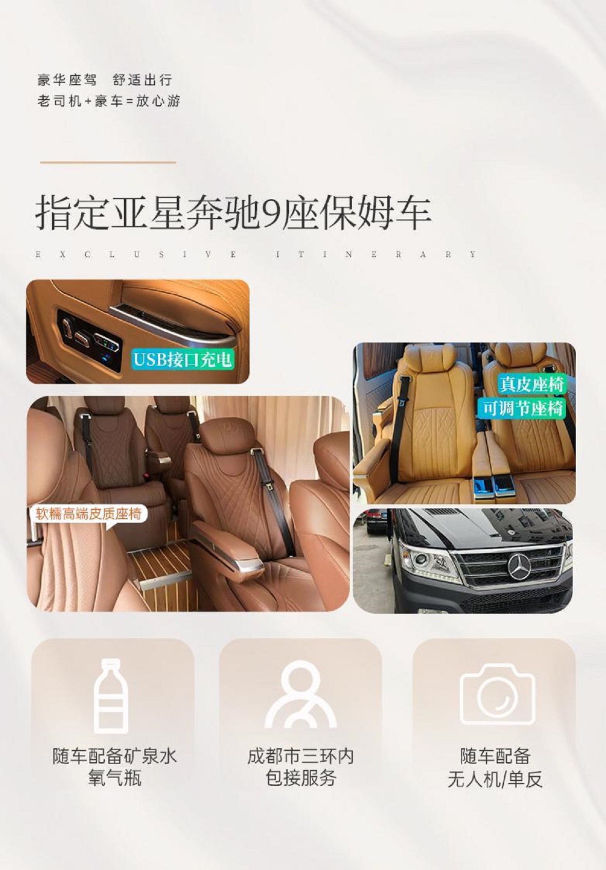 交通:指定亞星奔馳 9 座正規 1+1 帶 usb 充電保姆車,保證一人一正座。