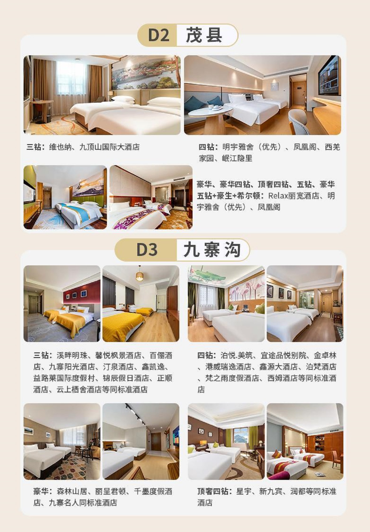 九寨溝三鉆/四鉆/豪華對應酒店:神仙居大酒店、鉑景酒店、云天大酒店、客烈賞林酒店、新區壹號酒店、鑫絨居民宿、金寶大酒店、豪斯朵酒店。