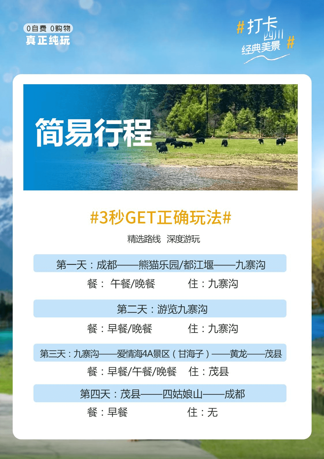 門票:九寨溝、黃龍、熊貓樂園/都江堰、四姑娘山、愛情海首道大門票(九寨優惠退 50 元,免票退 100 元。黃龍 優惠退 20 元,免票退 40 元;6 月起優惠退 50 元,免票退 100 元。熊貓樂園/都江堰優惠退 10 元,免票退 20 元。四姑娘山優惠退 20 元,免票退 40 元。愛情海無優免退費。)