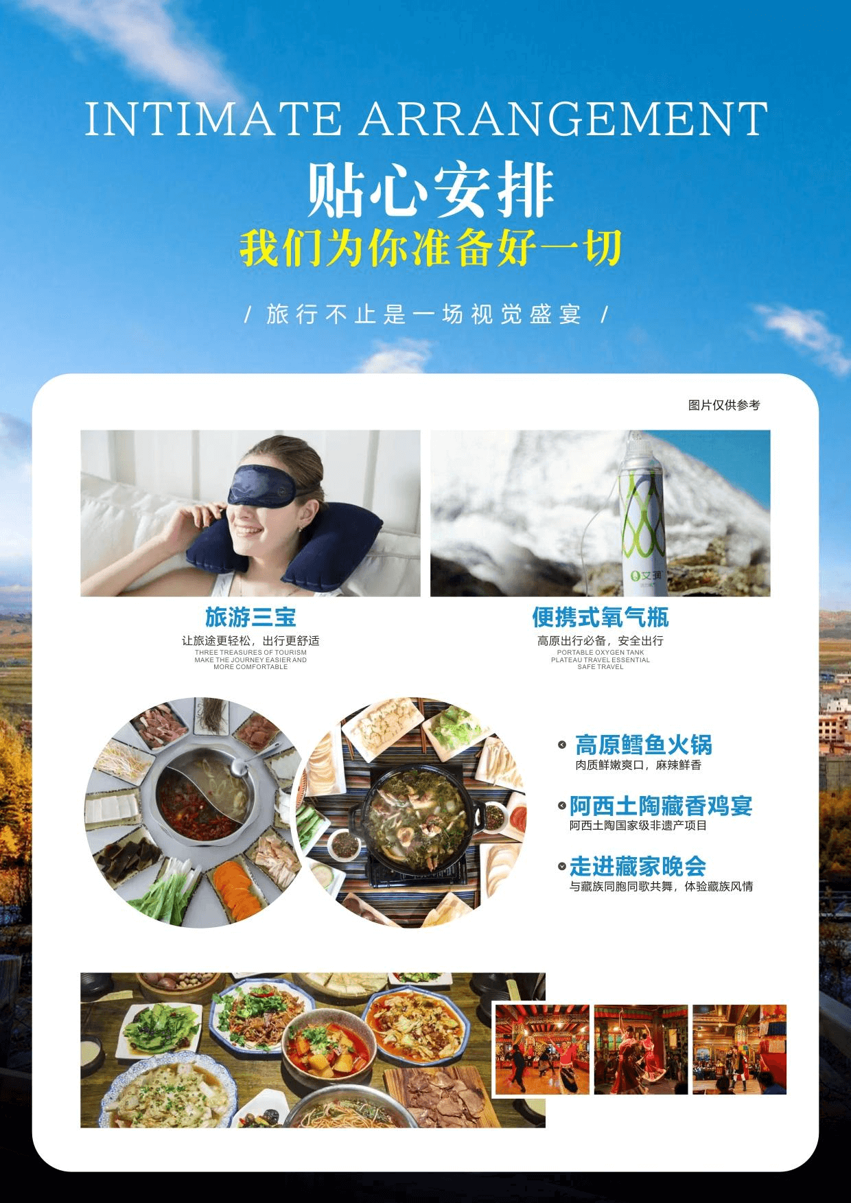用餐:全 4 早 8 正 超值贈送旅游三寶,便攜式氧氣,高原鱈魚火鍋,阿西土陶藏香雞宴,走進藏家歌舞晚會,藥膳牦牛肉湯鍋,精美旅拍-2 張精修電子照片(贈送項目,如果遇特殊原因無法贈送等,不用費用不退)。若遇特色餐暫停營業,則安排正常團餐。