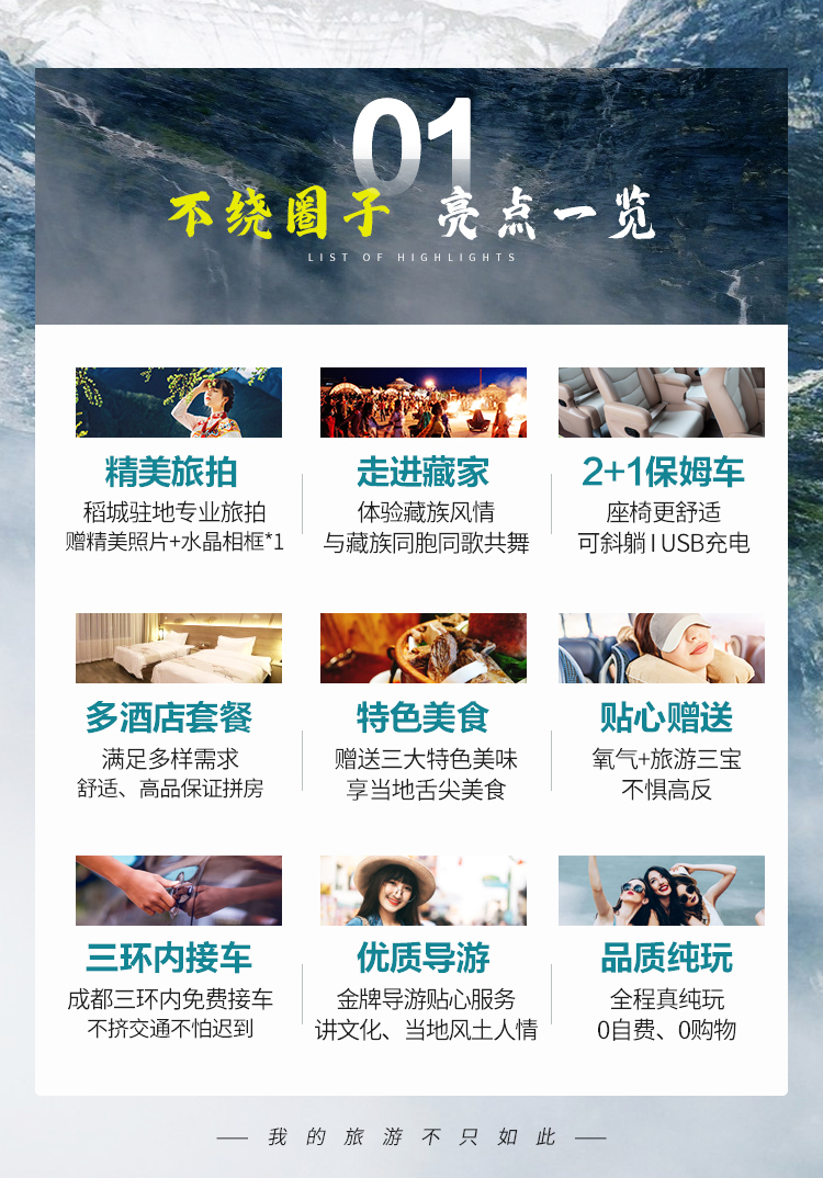 | 其它 | 1、必須消費:稻城亞丁觀光車120元,木格措觀光車90元,木雅圣地觀光車60元,勒通古鎮觀光車35元(共計:305元) 2、自愿消費:二進亞丁觀光車60,亞丁景區內電瓶觀光車80(往返)塔公寺20,木格措游船70,瀘定橋門票10,亞丁景區內騎馬305-500(以景區定價為準),自費及其他私人娛樂消費項目 3、特別提醒:特價產品,中途離團不退任何費用!!! |