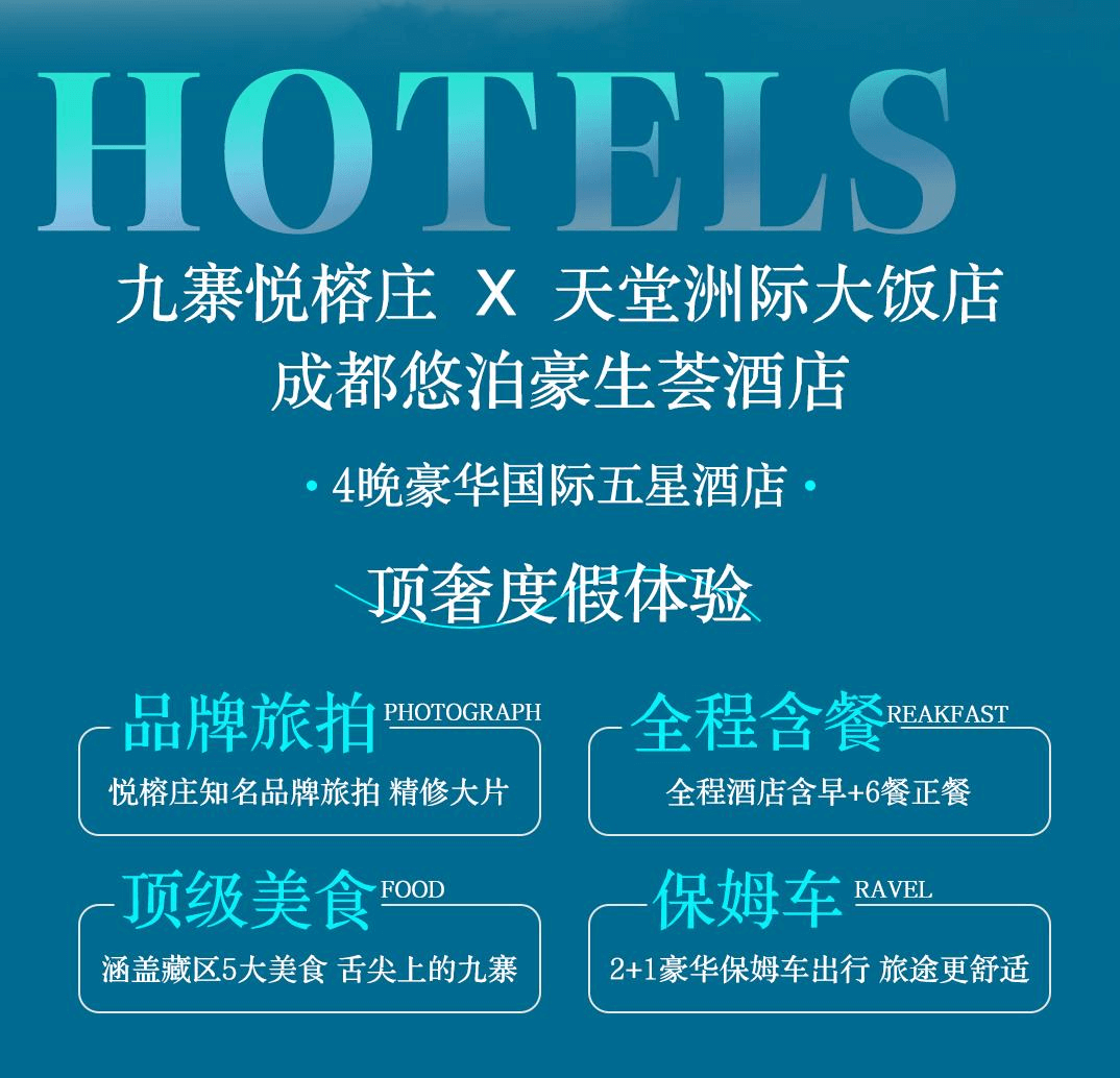 【住宿】兩晚不指定房型,默認酒店基礎房型雙人標間,兩晚成都悠泊豪生薈酒店或成都新希望高新中心假日酒店或成都金韻酒店或成都友豪錦江酒店;一晚九寨溝悅榕莊;一晚九寨天堂洲際大飯店;一晚川主寺亞日國際大酒店或松潘東格爾國際度假酒店或松潘藏王傳奇度假酒店