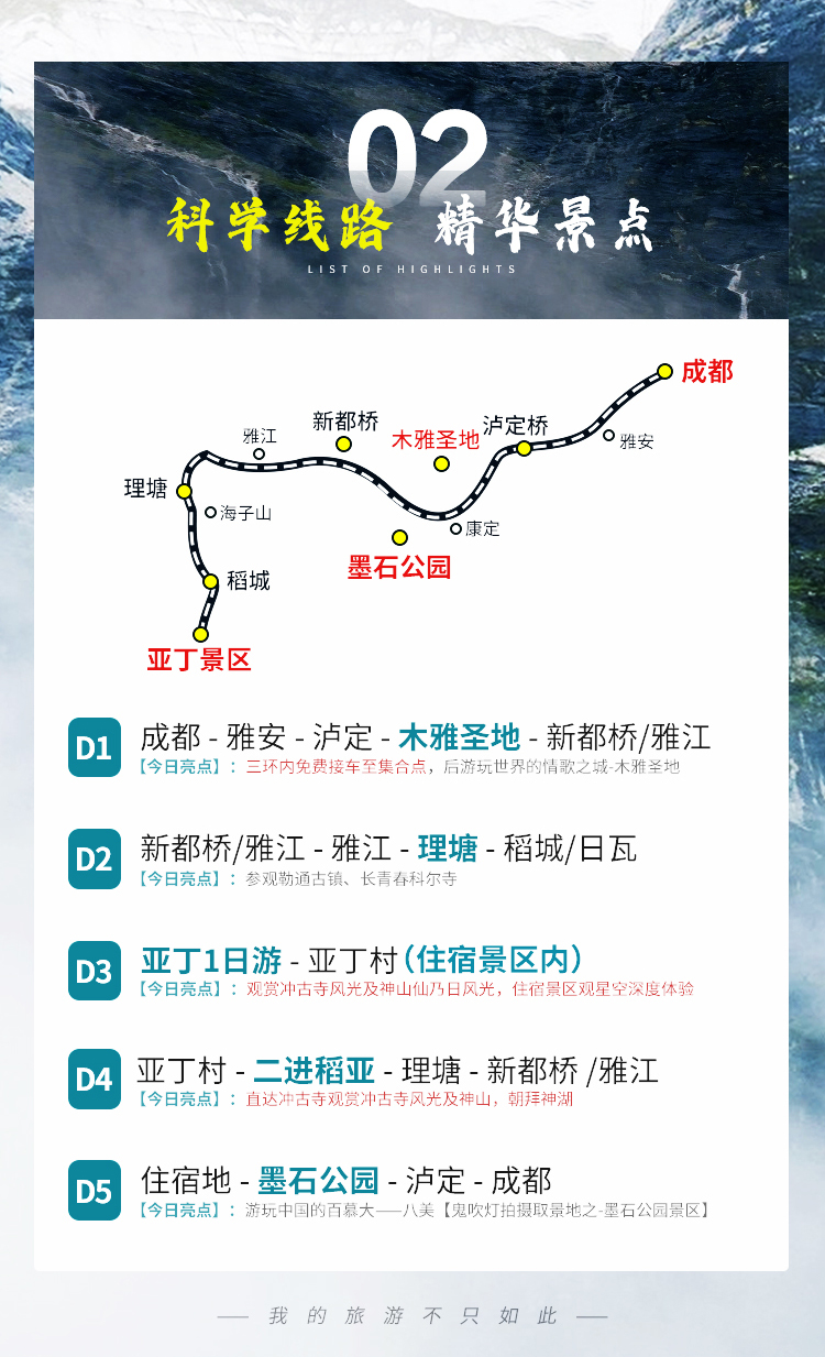 早統(tǒng)一集合上車出發(fā)(具體導(dǎo)游、師傅及車輛信息,在出團(tuán)前一天我社短信告知,請(qǐng)客人保持電話暢通!),經(jīng)成雅高速進(jìn)入甘孜藏族自治州境內(nèi)。(甘孜為藏語(yǔ),意思為潔白美麗。全州總面積15.37萬(wàn)平方公里,轄18個(gè)縣,90萬(wàn)人口,州府康定縣)。經(jīng)定縣(這里擁有舉世聞名的瀘定鐵索橋(瀘定橋或根據(jù)情況最后一天游覽),全長(zhǎng)103.67米。大橋于公元1706年建成,康熙皇帝取瀘水平定之意,御筆親書“瀘定橋”三個(gè)大字。正是當(dāng)年紅軍22勇士強(qiáng)渡大渡河,突破大渡河天險(xiǎn),紅軍才取得了陜北會(huì)師的勝利,因而瀘定鐵索橋也成為紅軍長(zhǎng)征史上的一座里程碑。)午餐后翻越康巴第一關(guān)折多山(海拔4298米)。后前往旅行社贈(zèng)送景點(diǎn)木雅圣地景區(qū),康定木雅圣地景區(qū)坐落于享譽(yù)世界的情歌之城康定折多山西側(cè)的“木雅辛康”,是甘孜州第一座以民俗風(fēng)情與自然風(fēng)光相結(jié)合的旅游景區(qū),也是全國(guó)第一個(gè)以體現(xiàn)藏族木雅文化為主題的專題旅游區(qū)。前往魚(yú)子西屬于木雅貢嘎地區(qū),擁有以藏傳佛教為基礎(chǔ)的基本文化特征,項(xiàng)目范圍內(nèi)可?360?度遙望藏區(qū)四大神山之一藏區(qū)“第二香巴拉”的雅拉神山全貌和四川最高峰“蜀山之王”的木雅貢嘎大雪山山系全貌,為貢嘎西坡地區(qū)難得的觀景攝影點(diǎn)。而后返回?cái)z影天堂【新都橋鎮(zhèn)】入住。 【重要提示】 1、?木雅圣地景區(qū)、魚(yú)子西2個(gè)景點(diǎn)為贈(zèng)送景點(diǎn),如因天氣、堵車、交通、其他管制等特殊原因不能前往,或者游客自愿放棄等主觀原因,造成贈(zèng)送項(xiàng)目沒(méi)有參加的,不等價(jià)退換,木雅圣地贈(zèng)送門票不在享受景區(qū)門票二次優(yōu)惠。 2、當(dāng)天路程以實(shí)際行車時(shí)間為準(zhǔn),參考時(shí)間約8小時(shí)左右。 3、當(dāng)天自理:瀘定橋門票10元/人、木雅圣地觀光車60元/人、魚(yú)子西交通換乘費(fèi)用60元/人。 4、前往魚(yú)子西游覽期間屬于自由活動(dòng),無(wú)陪同,需注意安全! 【溫馨提示】:成都市三環(huán)內(nèi)包接?。。?! 1?成都三環(huán)內(nèi)免費(fèi)小車接人到集合地,接人時(shí)間會(huì)比集合時(shí)間提前,具體接人時(shí)間和地點(diǎn),在出團(tuán)前?1?天?18:00-21:30?我社師傅通知,請(qǐng)客人保持電話暢通!如超過(guò)這個(gè)時(shí)段未接到旅行社接人師傅電話,請(qǐng)務(wù)必及時(shí)聯(lián)系客服!當(dāng)天早上出發(fā)較早,如含有成都住宿的游客,賓館早餐還未供應(yīng),請(qǐng)游客在出發(fā)前一天自行通知所住酒店準(zhǔn)備路早【路早:可供客人攜帶,路途中吃的早餐】,早上小車接送為拼車排站式接送,請(qǐng)遵守 和司機(jī)約定的時(shí)間,為了不影響他人的接送時(shí)間,每點(diǎn)司機(jī)只能等待?10?分鐘,超出10?分鐘,請(qǐng)自行前往集合地點(diǎn)費(fèi)用自理,敬請(qǐng)見(jiàn)諒! 2、因道路維修,部分路段實(shí)行交通管制,容易堵車不能準(zhǔn)點(diǎn)用餐,請(qǐng)路路途中自備干糧。 3、第一天行程比較辛苦,路途海拔落差比較大,請(qǐng)?jiān)诔霭l(fā)前一天晚,盡量休息好,將身體調(diào)整到最佳狀態(tài)。