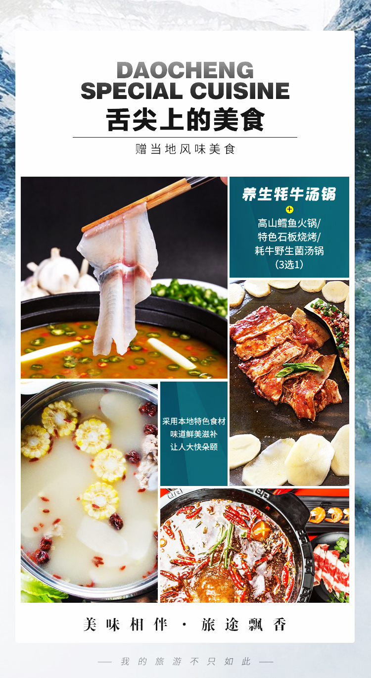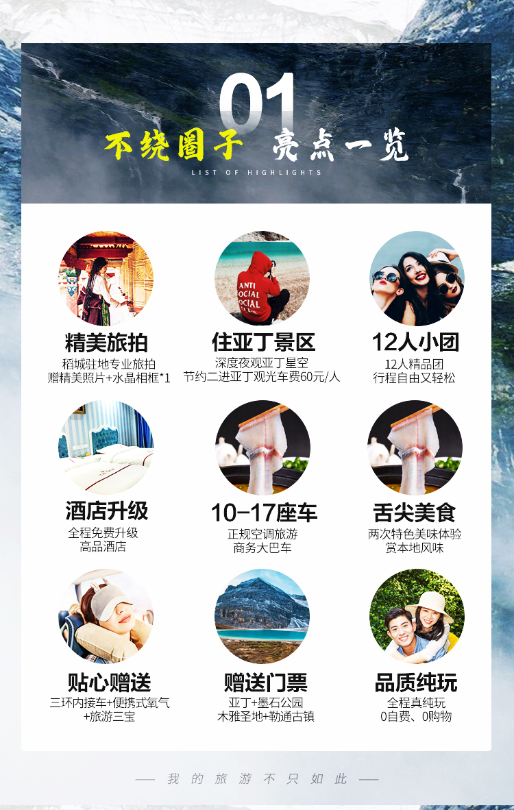 | 贈(zèng)送 | 1、【住亞丁村】全程高品酒店(升級(jí)1晚亞丁村民居,深度夜觀觀亞丁星空),還可以節(jié)約二進(jìn)亞丁觀光車費(fèi)60元/人; 2、【精美旅拍】贈(zèng)價(jià)值158元精美旅拍(精致水晶相框&1張精修照片)/或者亞丁景區(qū)內(nèi)精美旅拍。 3、【美食相伴】贈(zèng)當(dāng)?shù)仫L(fēng)味美食:高山鱈魚(yú)火鍋/特色石板燒烤/耗牛野生菌湯鍋(3選1)+贈(zèng)養(yǎng)生牦牛湯鍋 4、【貼心贈(zèng)送】成都三環(huán)內(nèi)接車服務(wù)+贈(zèng)高原氧氣+旅游三寶+贈(zèng)旅游意外險(xiǎn); |
