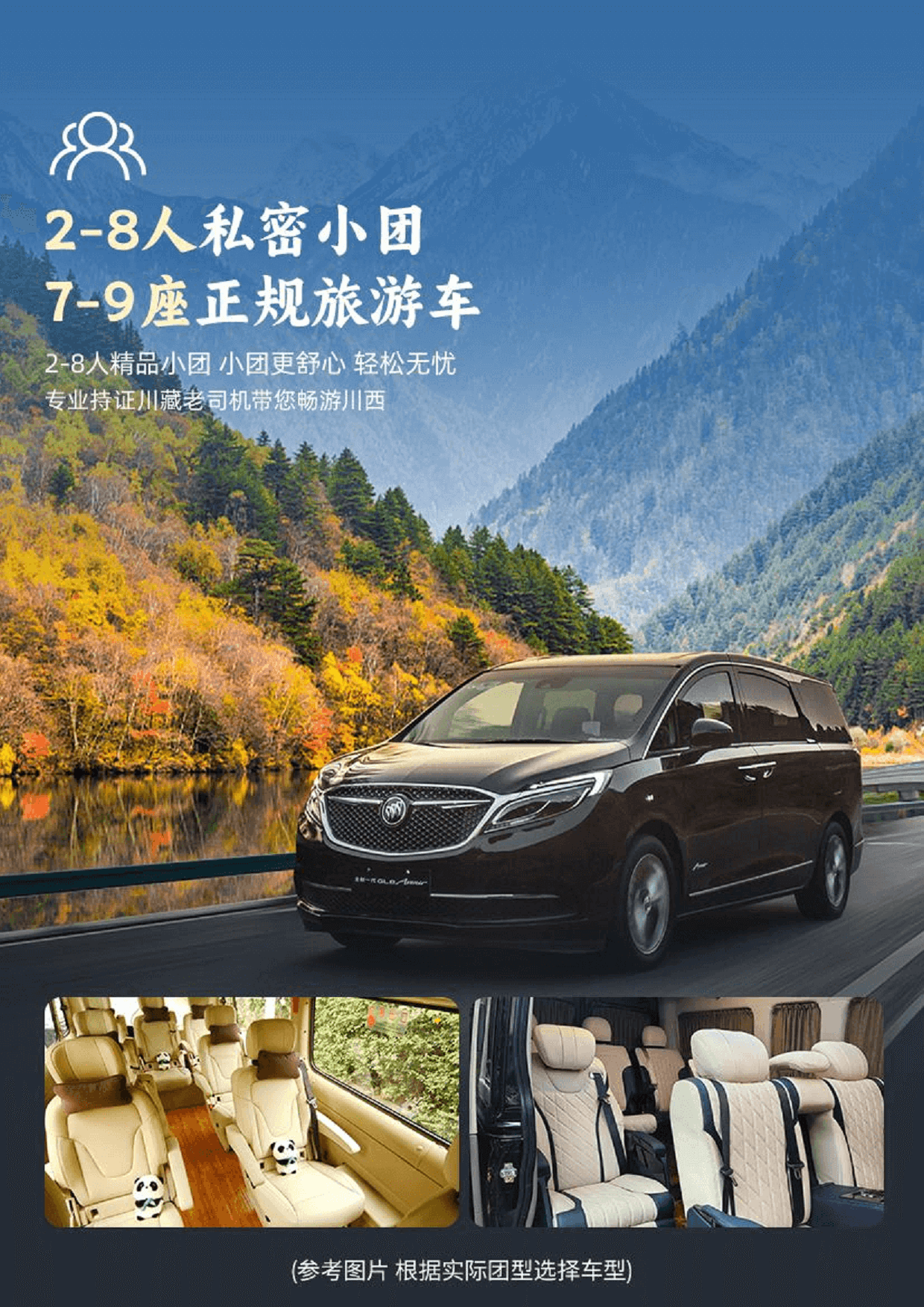1、【用車】行程段空調旅游車(7-9 座商務車型),一人一正座,不提供座次要求;散客拼團全程可能非同一臺車;散客接為旅行社贈送的面包車成都市內三環路內包接,接不配導游,完團成都市散團地點(不指定)統一散團,不含回送