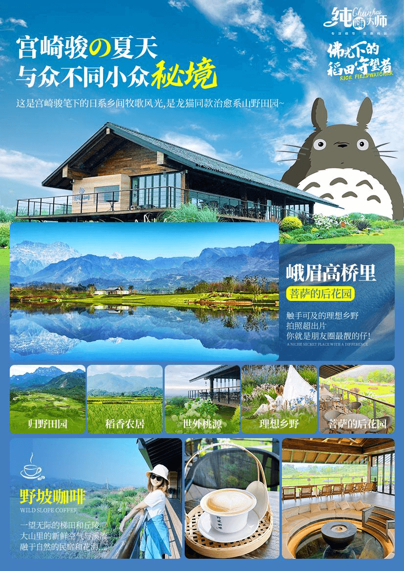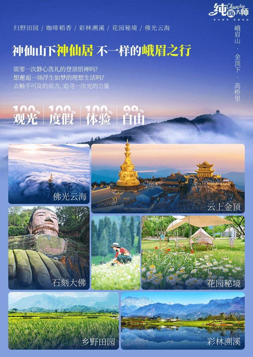 推薦理由:神仙山下神仙居,不一樣的峨眉之行,我們都是時間旅行者,為了尋找生命中的光,終其一生,行走在漫長的旅途上。 一生中至少要有兩次沖動,一次為奮不顧身的愛情,一次為說走就走的旅行。每天的生活,是上班下班,早出晚歸,每天的心情,是匆匆忙忙,麻木無力,還相信光的力量嗎?需要一次靜心洗禮的登頂悟禪嗎?想邂逅一場浮生如夢的理想生活嗎?峨眉山 ? 金頂下 ? 高橋里 沐浴著無數人心中文化坐標的輝光,在仙山佛光的庇佑下,體驗半山半水的田園生活。山野千里,野坡微風,隨手拍都是大片的感覺。 生活,永遠是在路上,在觸手可及的前方歸野田園 咖啡稻香 彩林溯溪 花園秘境 佛光云海,去體驗一次與眾不同的山野自然美學去融入一場與自然共生的在地美學實踐
