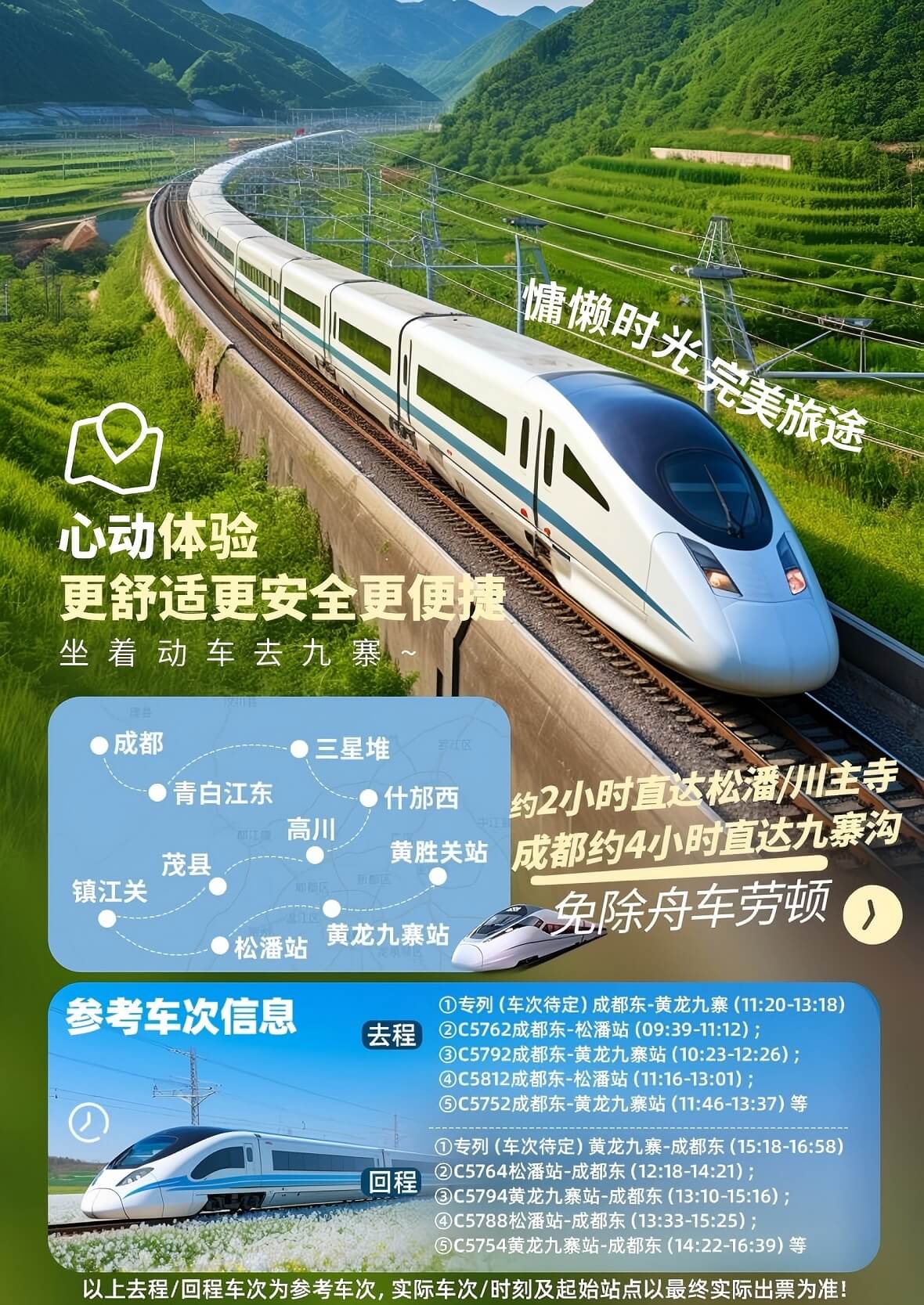 去程參考車次:5-10月優先專列(車次待定)成都東-黃龍九寨(11:20-13:18);