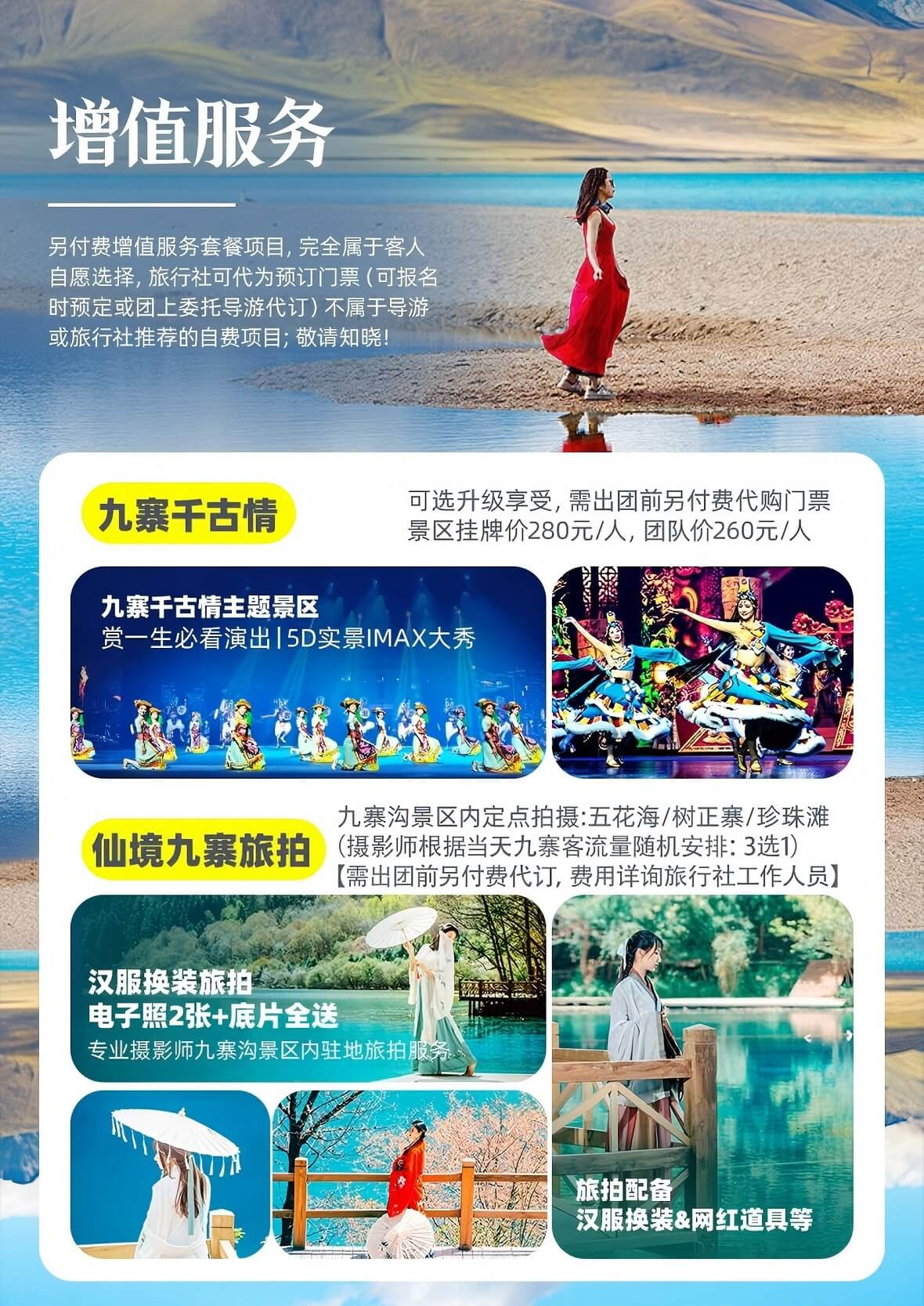 【增值服務 2】-【仙境九寨旅拍】:【可選升級,需出團前另付費代訂,費用詳詢旅行社工作人員】 九寨溝景區內定點旅拍服務:含精修漢服或藏服換裝旅拍電子照 2 張+底片全送 (風情晚會/旅拍屬于旅行社提供的另付費增值服務套餐項目,完全屬于客人自愿選擇,旅行社可代為預訂門票(可報名時預定或團上委托導游代訂);不屬于導游或旅行社推薦的自費項目;敬請知曉!)