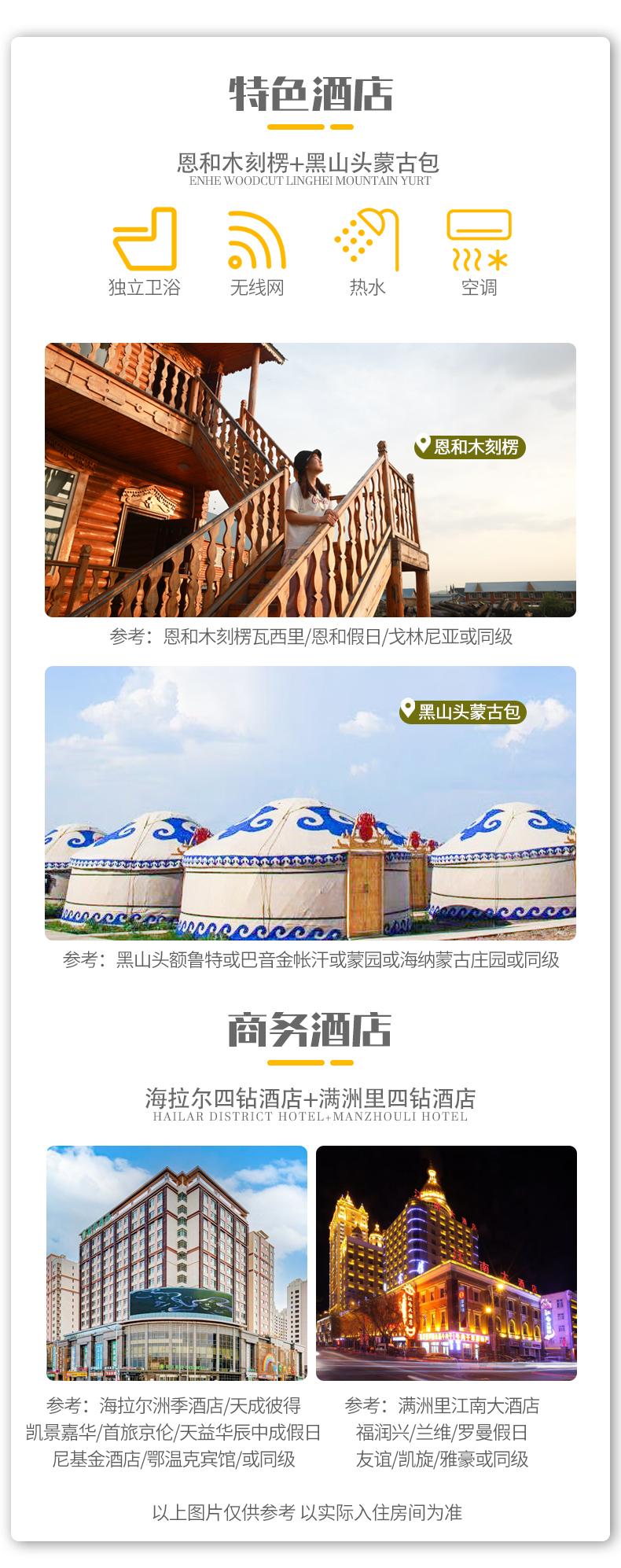 1、住宿:海拉爾四鉆酒店雙標(biāo)間1晚,滿(mǎn)洲里四鉆酒店雙標(biāo)間1晚,黑山頭蒙古包雙標(biāo)間1晚,恩和木刻楞雙標(biāo)間2晚;