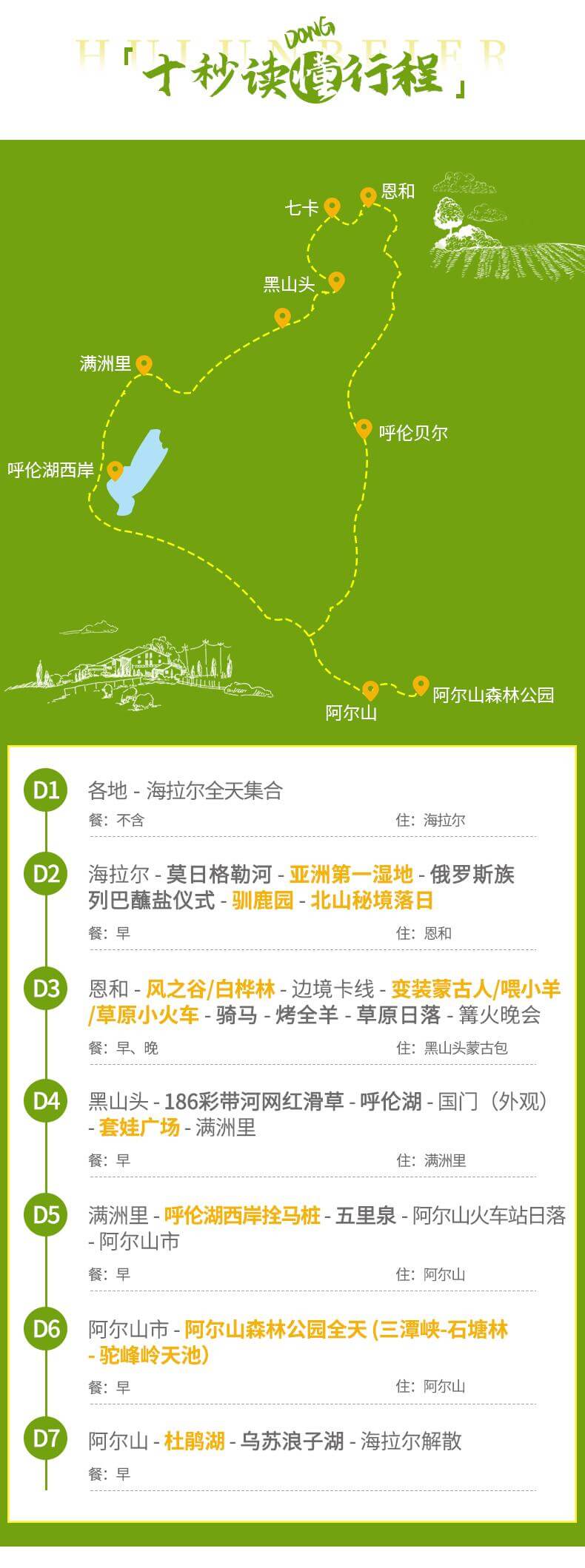 4、門票:額爾古納濕地景區(qū)+環(huán)保車、呼倫湖門票、馴鹿園門票、阿爾山森林公園+環(huán)保車、套娃廣場表演套票(大馬戲表演為7-8月開始,其他游覽項目正常開放,如因景區(qū)原因或下雨等惡劣天氣取消不退費用);