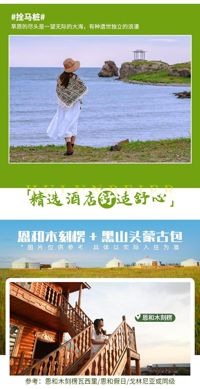 嚴選住宿:海拉爾三鉆酒店或同級,恩和木刻楞,黑山頭蒙古包,滿洲里四鉆大酒店或同級,阿爾山市三鉆酒店或同級,阿爾山景區(qū)內(nèi)家庭旅館或同級;