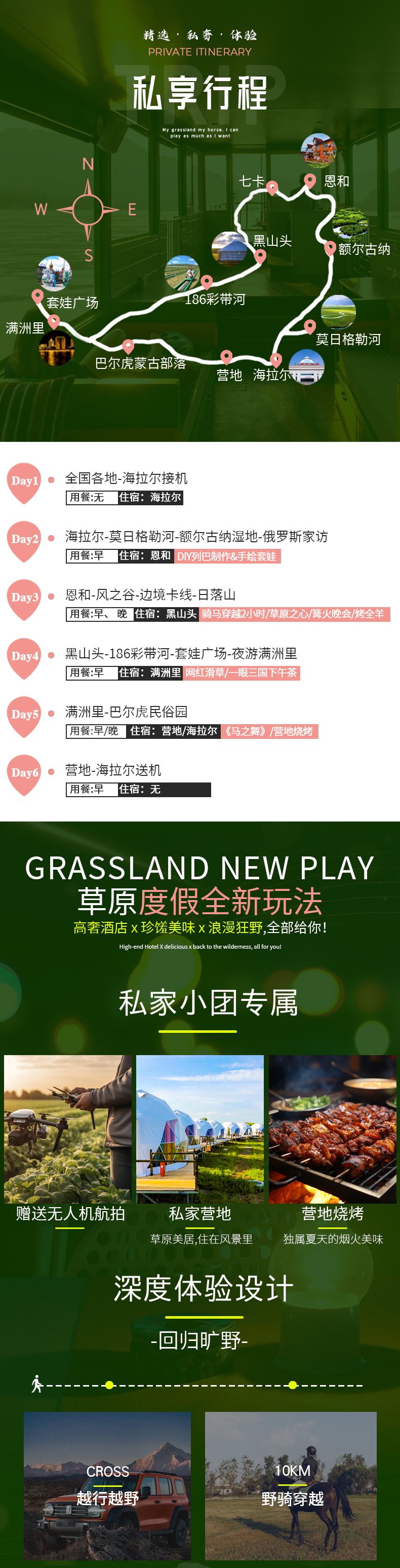 小眾玩法:草原之心、風之谷、俄羅斯族列巴蘸鹽儀式、尋跡鹿蹤、逐草夕陽下; 民俗深度:草原三藝、撞彩蛋、俄、蒙雙語小課堂; 精華美景:草原野奢露營地、俄羅斯&蒙古風情、最美邊境公路&草原腹地穿越; 舒適旅程:全程SUV,老司機開路,保障旅途舒適舒心。