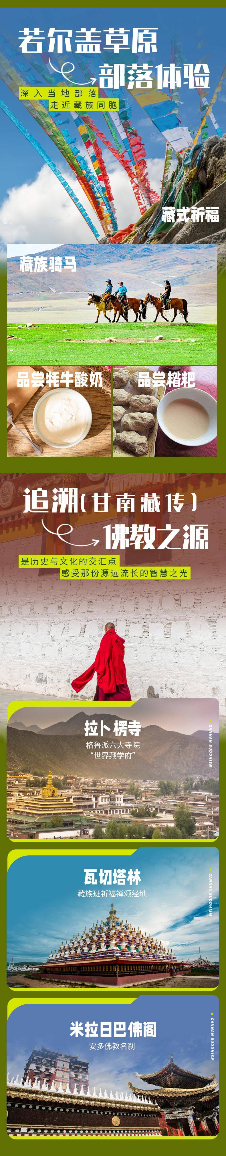 精華美景:漫步桑科草原、打卡仙境扎尕那/九曲黃河第一彎/川西網紅秘境蓮寶葉則。 佛源追溯:探尋藏傳格魯派拉卜楞寺、班禪頌經地瓦切塔林、安多佛教名剎米拉日巴佛閣。