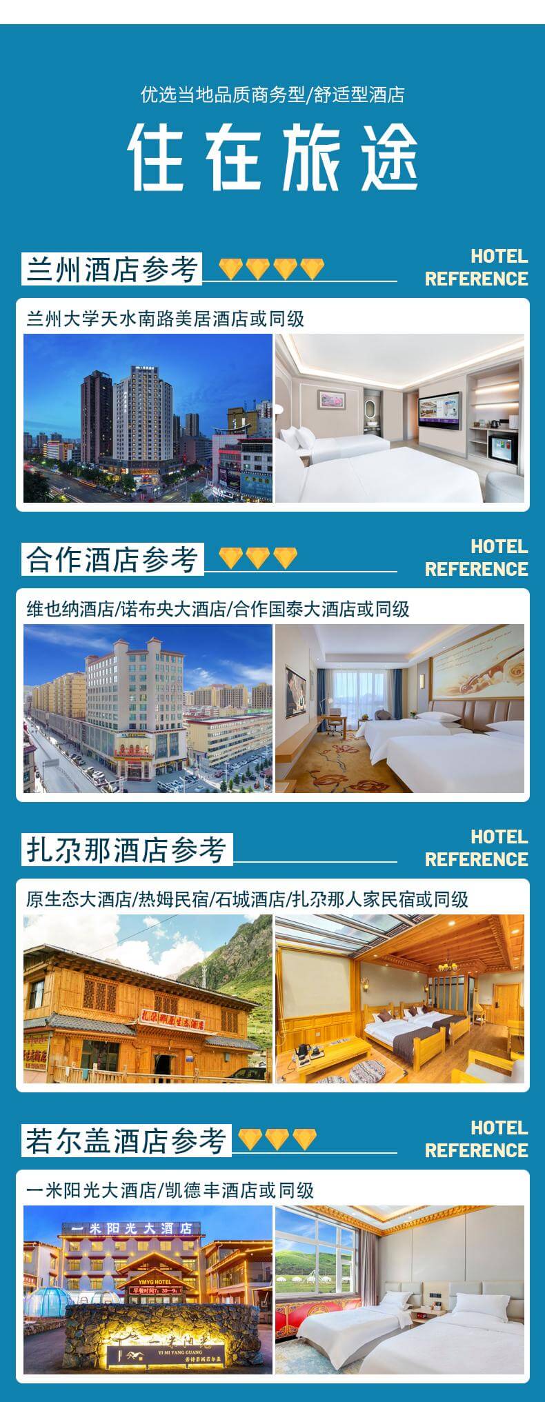 1.住宿:蘭州4鉆酒店標(biāo)間1晚、合作市3鉆酒店標(biāo)間1晚、扎尕那藏式民俗標(biāo)間1晚、若爾蓋縣3鉆酒店標(biāo)間1晚、九寨溝溝口4鉆酒店標(biāo)間1晚、川主寺鎮(zhèn)4鉆酒店標(biāo)間1晚