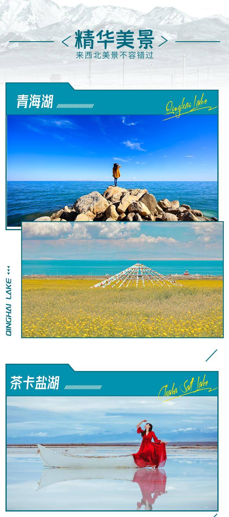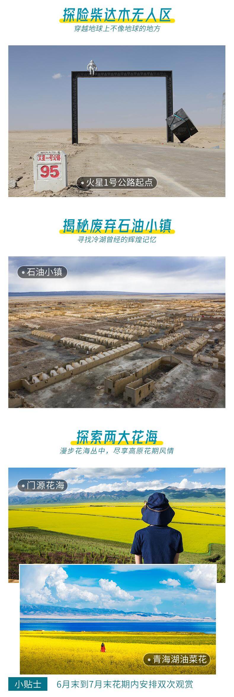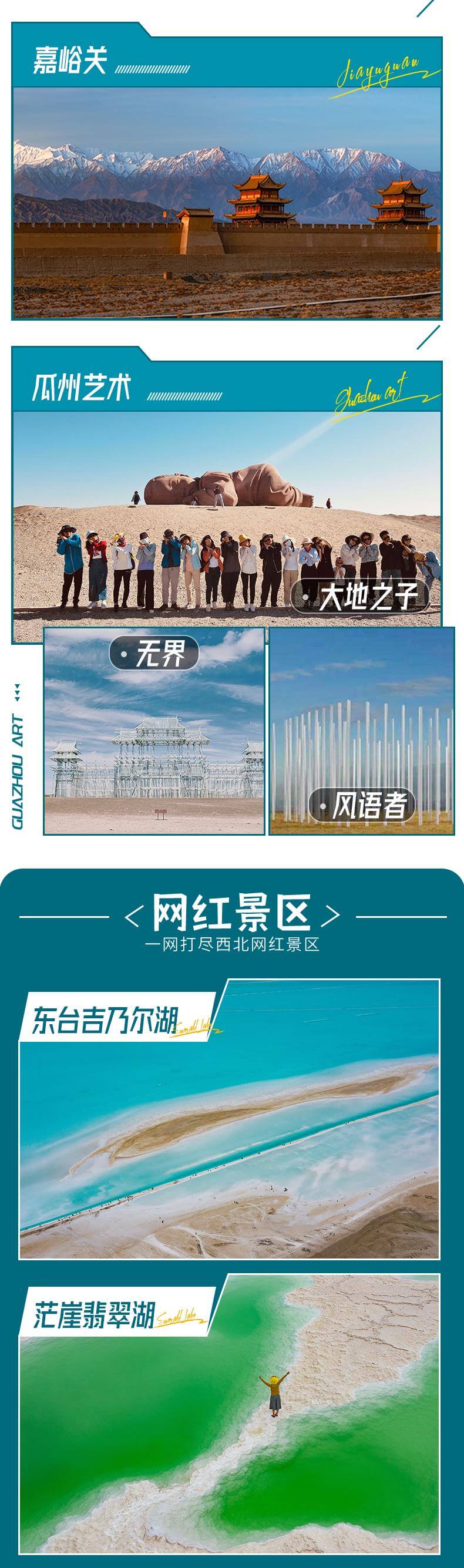 網(wǎng)紅打卡:網(wǎng)紅察爾汗鹽湖,東臺吉乃爾湖,水上雅丹,雙色湖,尕斯庫勒湖,惡魔之眼,茫崖翡翠湖,遠觀人間月球黑獨山,遺落孤城!一次出行盡享西北,不留遺憾! 文藝解鎖:青海湖環(huán)湖騎行、湖邊下午茶、贈送漂流瓶裝滿鹽粒沙粒,瓜州藝術(大地之子/無界/風語者) 西北印象:火星一號公路起點、U型公路打卡,拍出屬于你自己的公路大片~