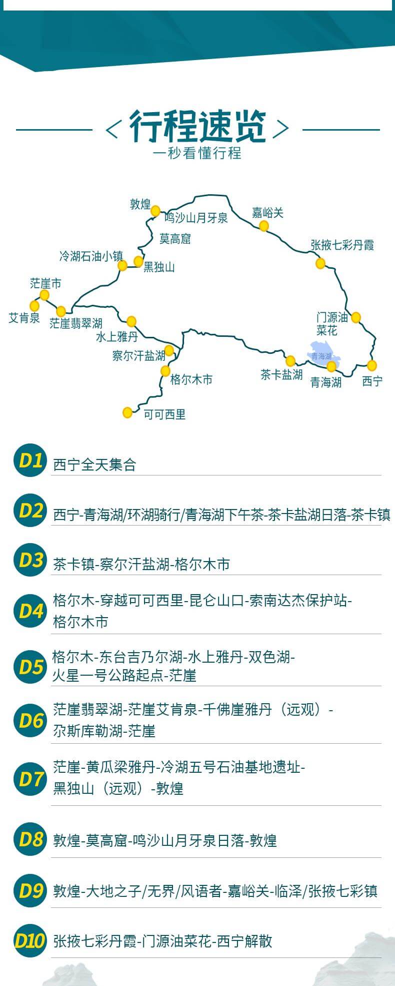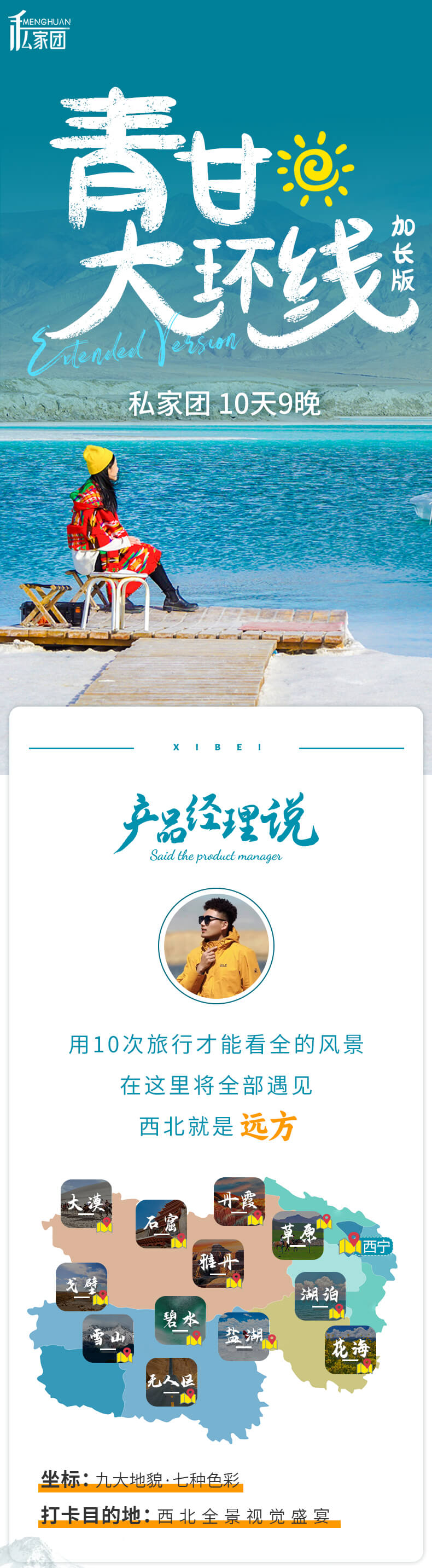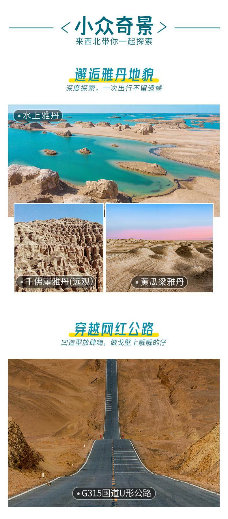 網(wǎng)紅打卡:網(wǎng)紅察爾汗鹽湖,東臺吉乃爾湖,水上雅丹,雙色湖,尕斯庫勒湖,惡魔之眼,茫崖翡翠湖,遠觀人間月球黑獨山,遺落孤城!一次出行盡享西北,不留遺憾! 文藝解鎖:青海湖環(huán)湖騎行、湖邊下午茶、贈送漂流瓶裝滿鹽粒沙粒,瓜州藝術(大地之子/無界/風語者) 西北印象:火星一號公路起點、U型公路打卡,拍出屬于你自己的公路大片~