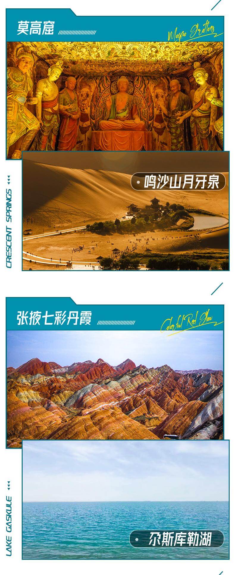 精華美景:國內最大內陸湖泊青海湖、天空之境茶卡鹽湖、黃瓜梁雅丹、東方藝術寶庫莫高窟、中國最美沙漠之一鳴沙山月牙泉、天下雄關嘉峪關、中國最美丹霞地貌之一七彩丹霞、青海湖油菜花+門源花海(6月末到7月末花期內安排雙次觀賞);
