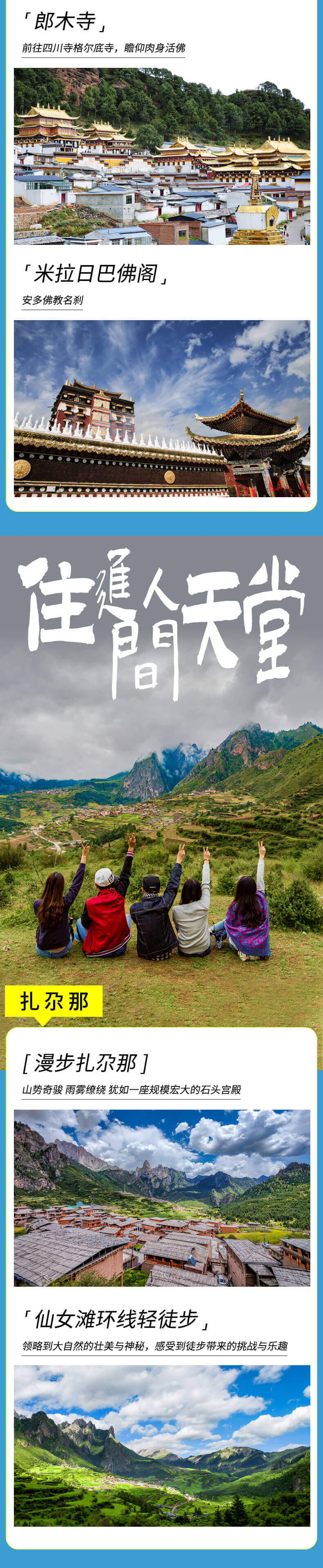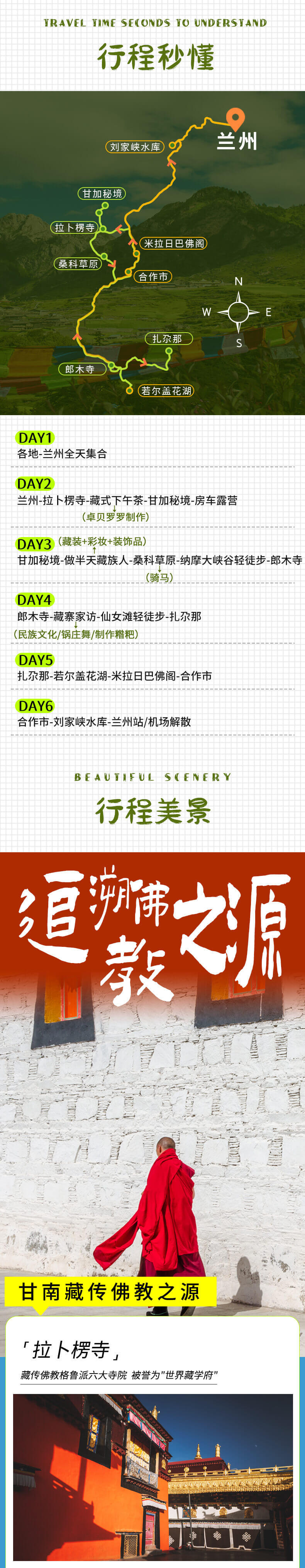 精華美景:漫步桑科草原、打卡仙境扎尕那/甘加秘境/郎木寺/若爾蓋花湖。 佛源追溯:探尋藏傳格魯派拉卜楞寺、米拉日巴佛閣、藏傳佛教勝地郎木寺。 小眾體驗:體驗藏族部落地道下午茶及制作當地特色手工卓貝羅羅,藏裝打扮漫步桑科草原騎馬、扎尕那藏學跳鍋莊舞!
