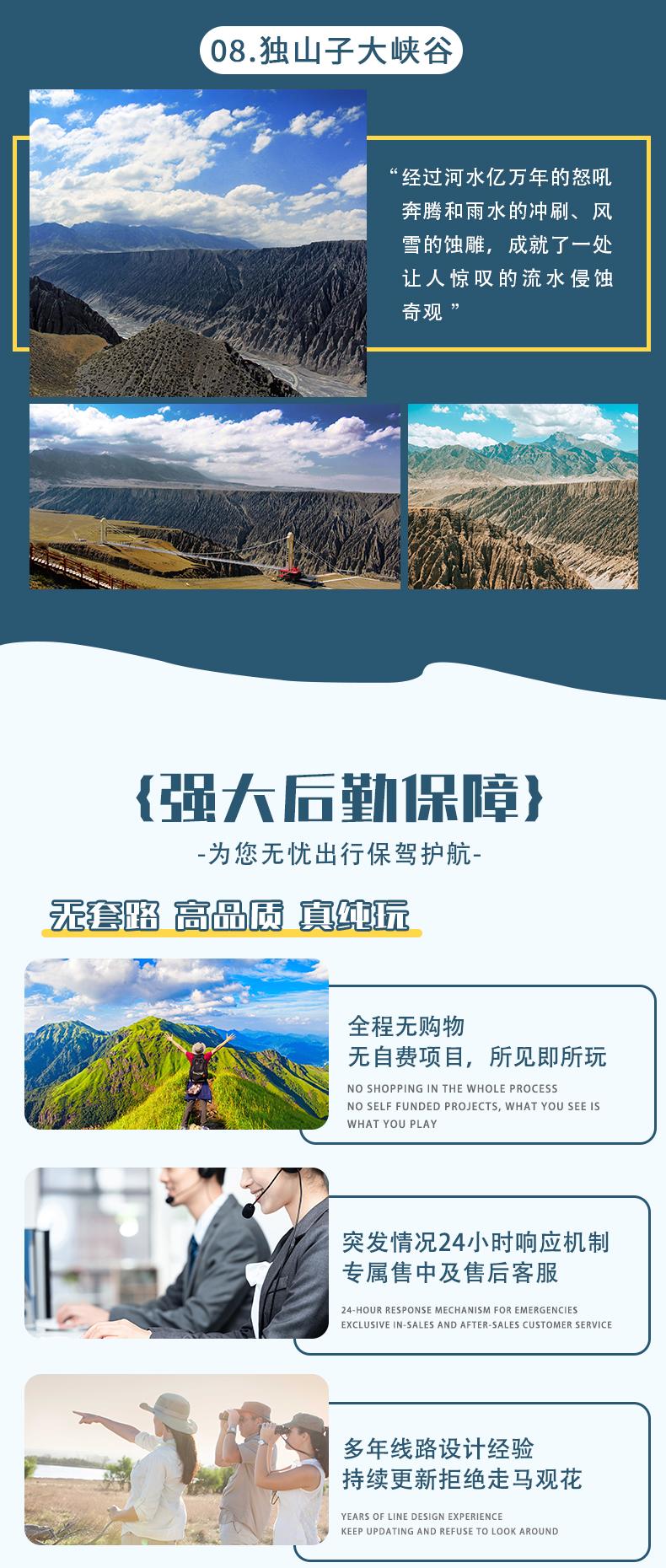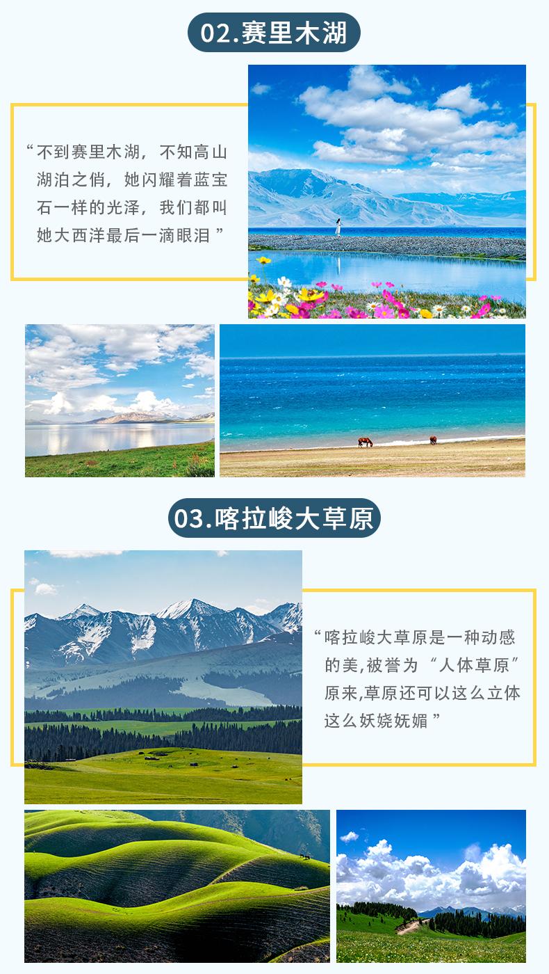 4、門(mén)票:天山天池門(mén)票+環(huán)保車(chē),賽里木湖門(mén)票+自駕費(fèi)用,喀拉峻門(mén)票+環(huán)保車(chē),闊克蘇峽谷門(mén)票+環(huán)保車(chē)+擺渡船,那拉提空中草原門(mén)票+環(huán)保車(chē),獨(dú)山子大峽谷門(mén)票;