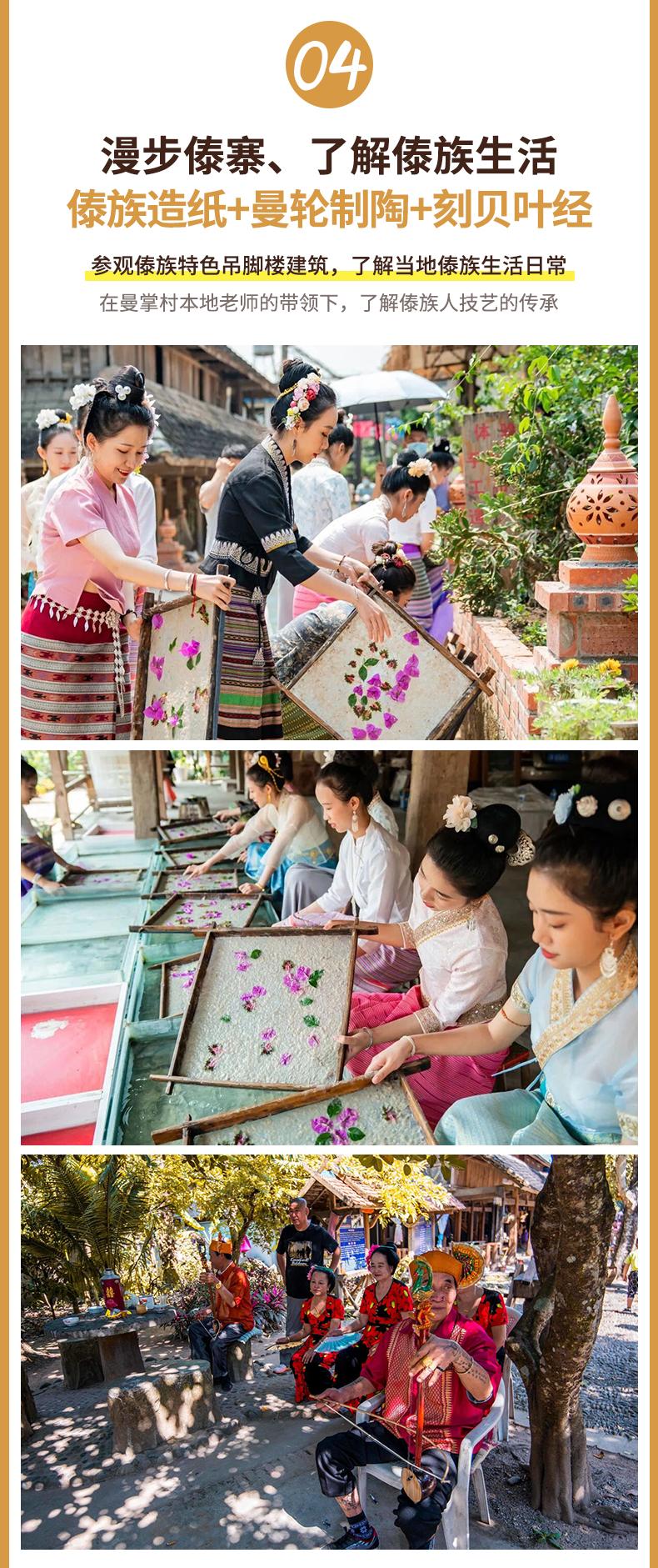 13:00?到達(dá)前往《讓我聽懂你的語言》的取景地【曼掌傣寨】,它擁有18項文化遺產(chǎn)的曼掌村寨,首先漫步環(huán)游整個原生態(tài)傣族村寨,然后留出時間自由活動,這里有豐富的非遺文化手工體驗活動,大家可以在這里自行選擇體驗。