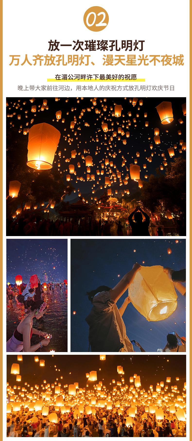 17:00? 返回告莊,晚上來到【瀾滄江畔】參加【孔明燈祈?;顒印?/span>。這是潑水節(jié)很重要的一項活動,萬人齊放孔明燈、放水燈祈福,場面甚是壯觀、唯美,獨具傣族特色。結(jié)束后大家可以選擇自由活動,閑逛東南亞風(fēng)情濃郁的【星光夜市】,享受夜市的美食、美景、美人。