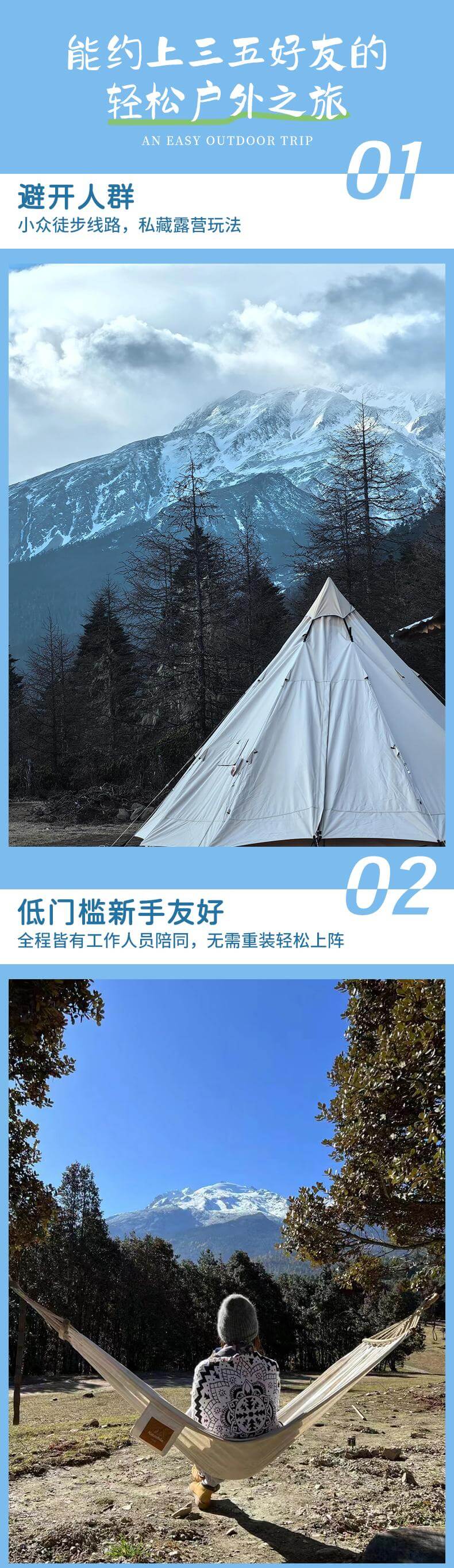 原創策劃:線路原創設計,產品團隊每季度均需實地考察,不斷優化,保障游玩體驗; 精品小團:每團均不超過14人,拒絕大巴團去徒步,人多雜亂,只為體驗安排; 多種體驗:安排HALF-WAY網紅打卡,哈巴帳篷營地下午茶&晚餐,對雪山舉杯