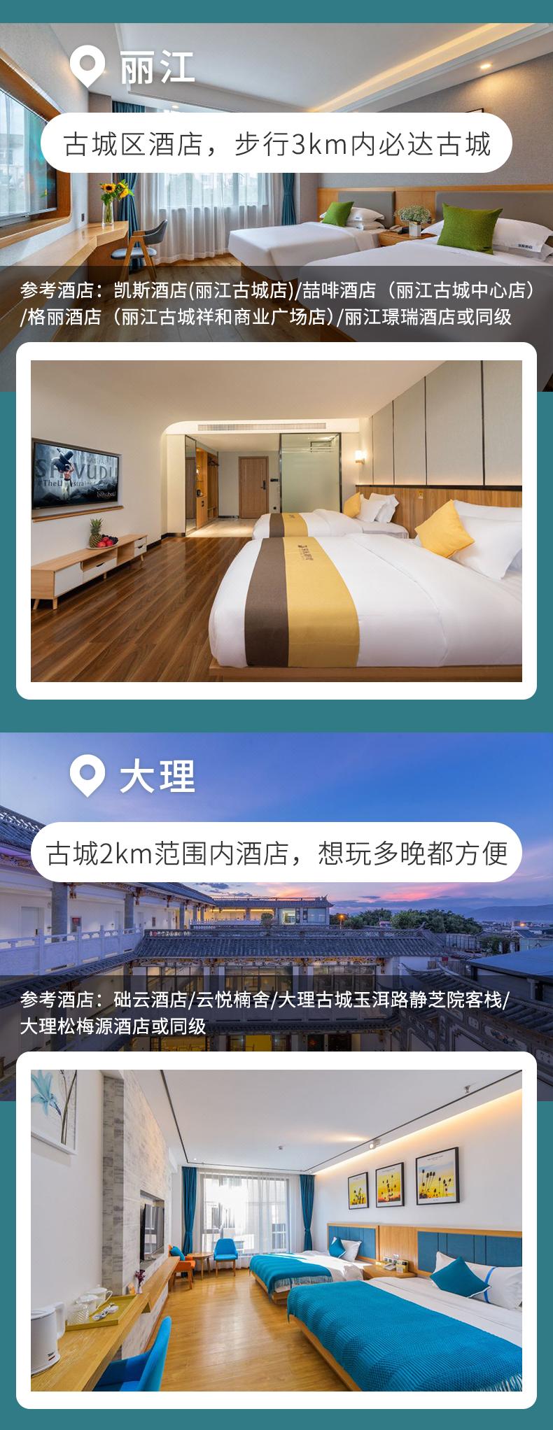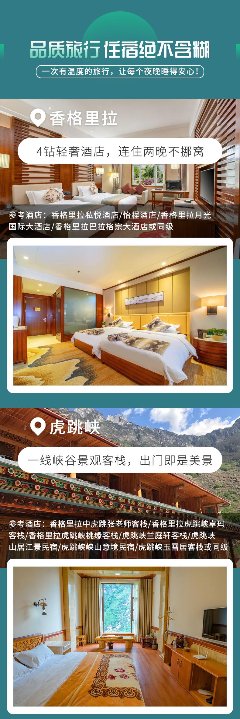 1、住宿:麗江1晚(參考:凱斯酒店(麗江古城店)或喆啡酒店(麗江古城中心店)或格麗酒店(麗江古城祥和商業廣場店)或麗江璟瑞酒店或同級),虎跳峽1晚(參考:香格里拉中虎跳張老師客棧或香格里拉虎跳峽卓瑪客棧或香格里拉虎跳峽桃緣客棧或虎跳峽蘭庭軒客棧或虎跳峽山居江景民宿或虎跳峽峽山意境民宿或虎跳峽玉雪居客棧或同級),香格里拉2晚(參考:香格里拉私悅酒店或怡程酒店或香格里拉月光國際大酒店或香格里拉巴拉格宗大酒店或同級),大理1晚(參考:礎云酒店或云悅楠舍或大理古城玉洱路靜芝院客棧或大理松梅源酒店或同級);