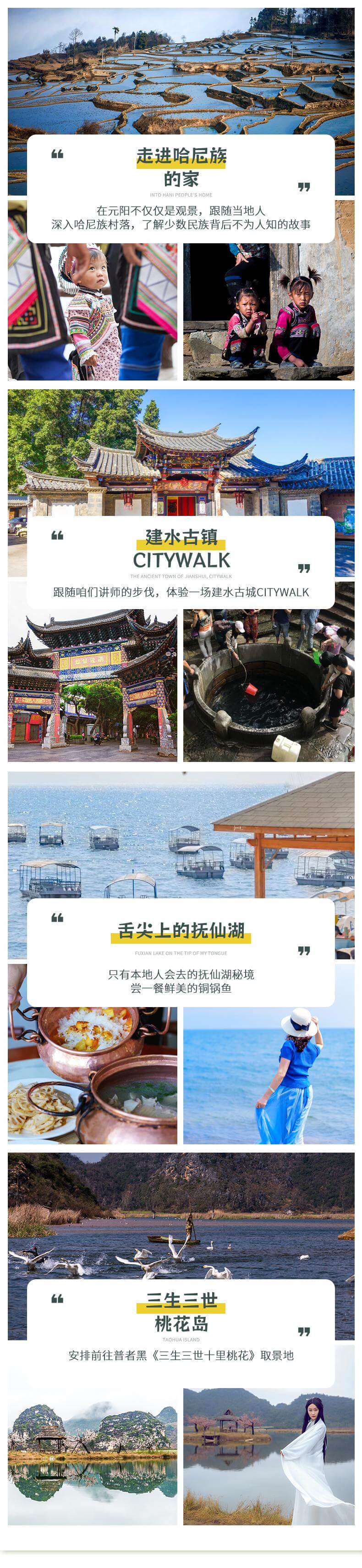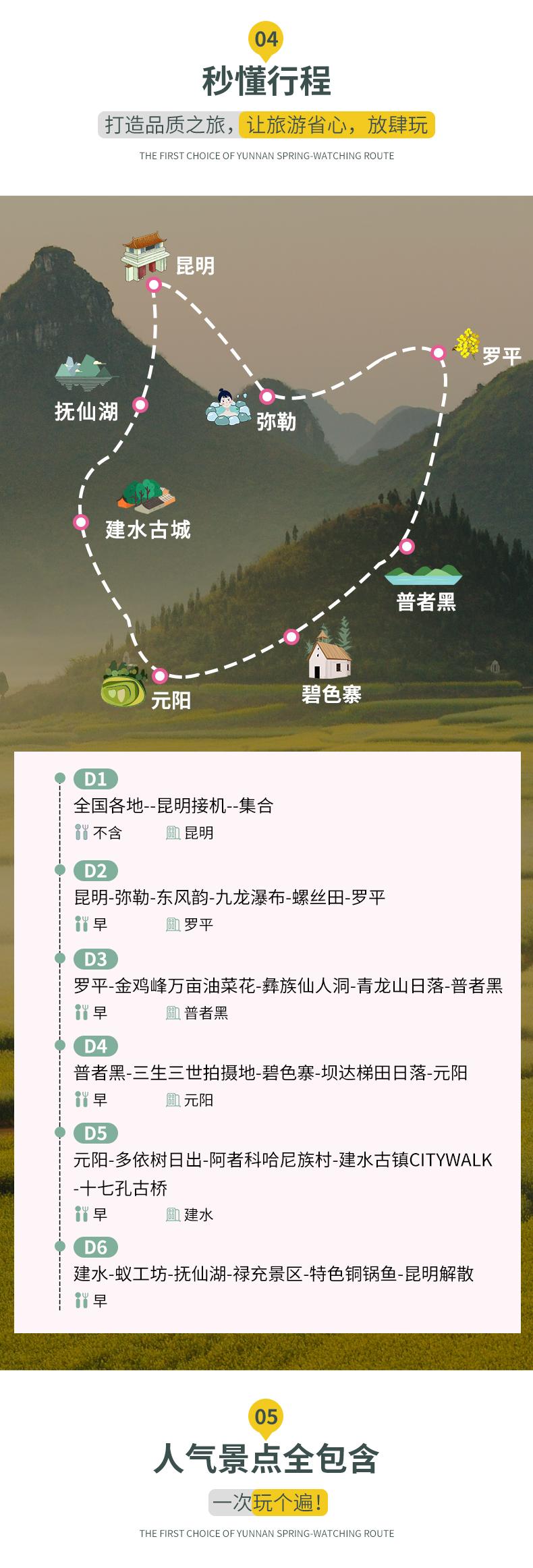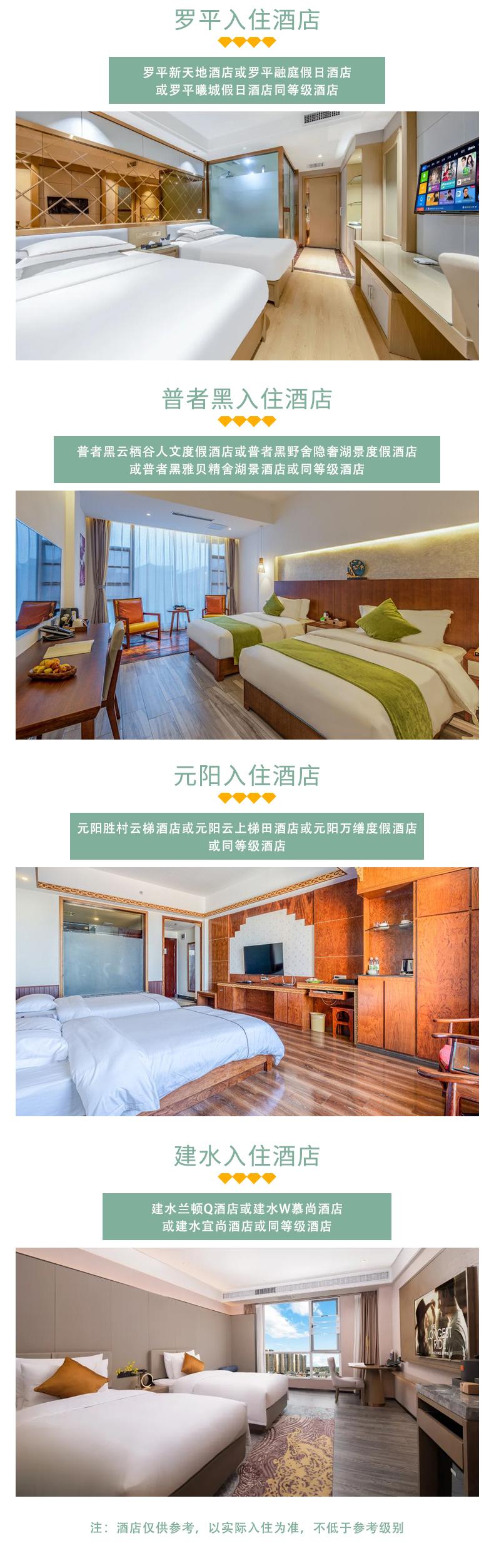 4、門票:東風韻景區(含電瓶車),九龍瀑布景區,金雞峰景區,普者黑景區,三生三世,碧色寨,元陽梯田景區,阿者科,建水古鎮citywalk,蟻工坊,祿充景區;