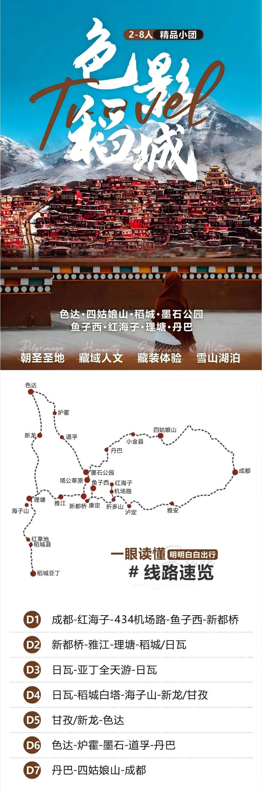 早餐后出發前往天路十八彎【天路十八彎觀景臺】無門票,海拔約3900m,游玩時間約20分鐘。天路十八彎路呈U字型,整個路段共有三處觀景臺,可觀賞壯觀的道路景象;午餐贈送特色美食【鱈魚火鍋】午餐后出發前往理塘【勒通古鎮】無門票,博物館需付費進入,費用自理,游玩時間約1小時;“勒”意為青銅,“通”意為草原,意為平坦如銅鏡的草原;勒通古鎮?千戶藏寨是六世喇嘛倉央嘉措詩歌中預言轉世的緣起之地,亦是網紅丁真珍珠工作的地方。富有濃郁的藏族傳統生活氣息。【卡子拉山觀景臺】無門票,游玩時間約10分鐘。后途經前往桑堆雪域高原服務中心(高原旅游知識宣傳點),時間20-30分鐘,了解高原預防知識,高原服務中心有兜售防寒衣物,氧氣或抗高反藥物,有工作人員上車講解,如有需要謹慎購買。此行為與旅行社無關! 敬請知悉!到達日瓦鎮用完晚餐后送回酒店休息。