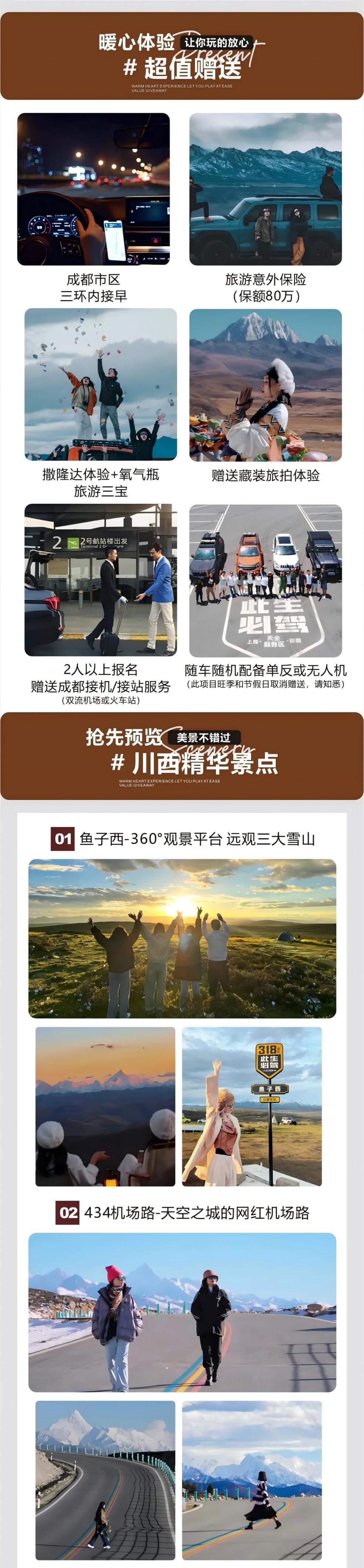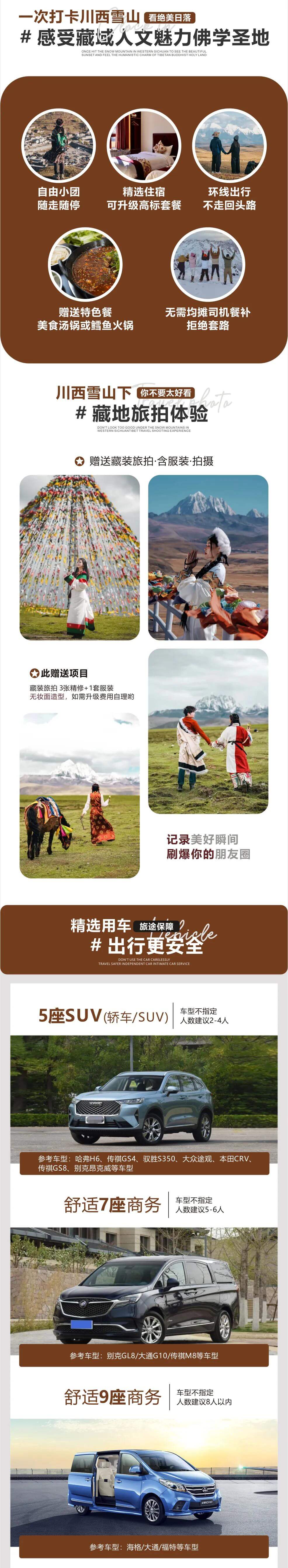 藏地旅拍體驗:贈送藏族旅拍,含服裝·拍攝,3張精修照片;小車出行:5座舒適SUV或7座舒適商務車,出行更安全,全程獨立用車; 暖心贈送:市區三環內接早+旅游意外險+旅游三寶+隨車配備單反或無人機;