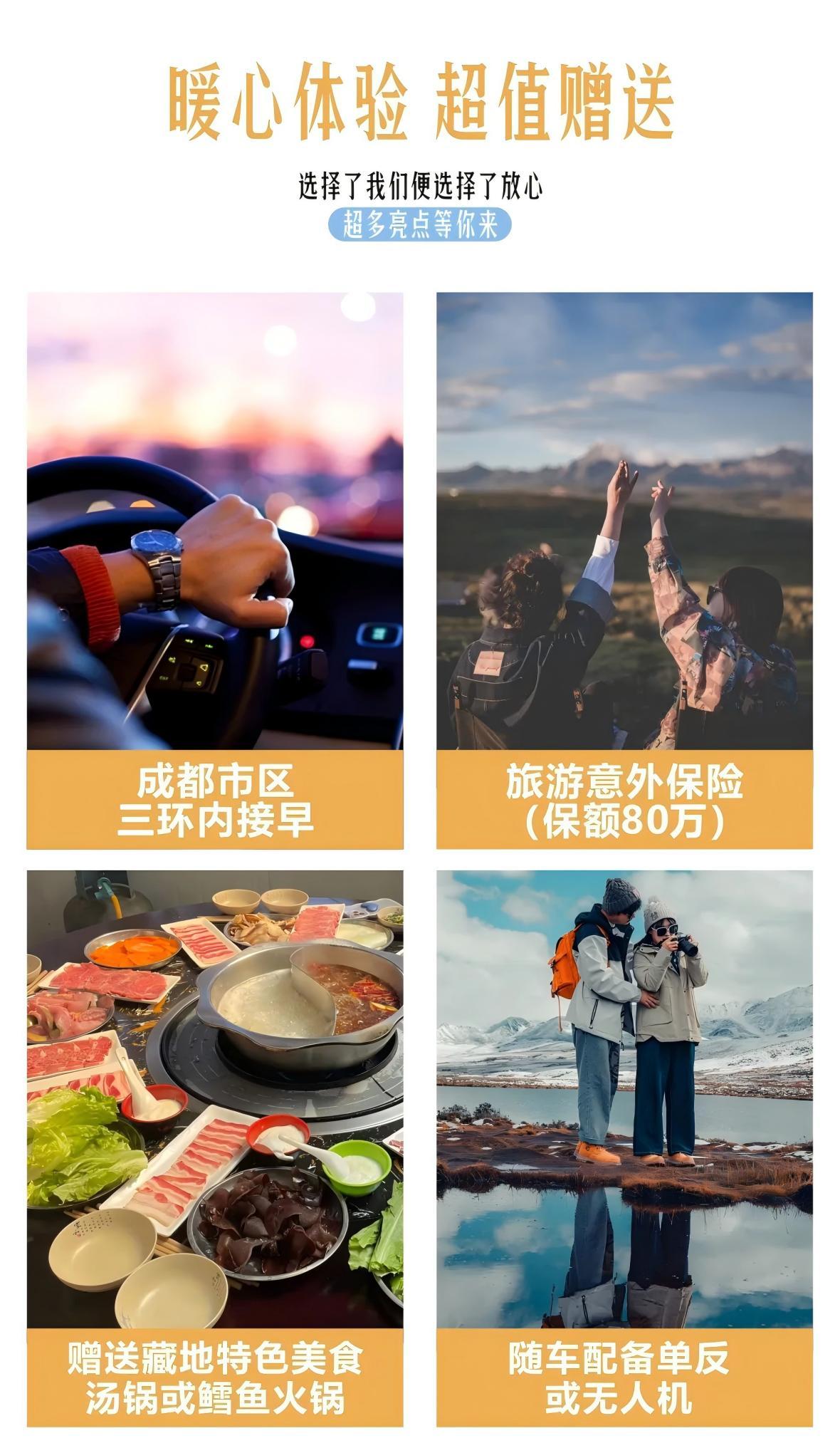 藏地旅拍體驗:贈送藏族旅拍,含服裝·拍攝,5張底片,3張精修照片; 小車出行:5座舒適SUV或7座舒適商務(wù)車,出行更安全,全程獨立用車;