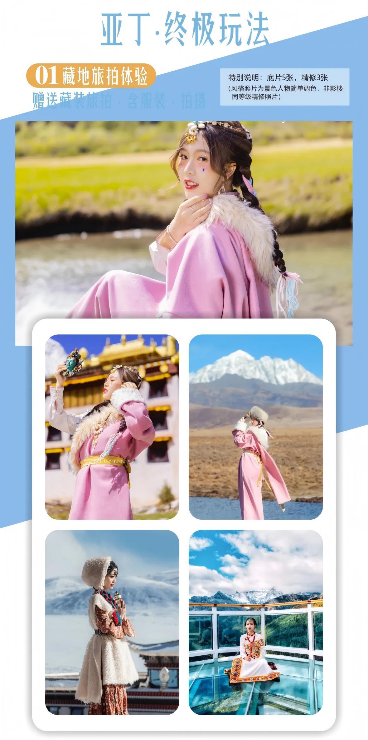 1、藏地旅拍體驗:贈送藏族旅拍,含服裝·拍攝,5張底片,3張精修照片;